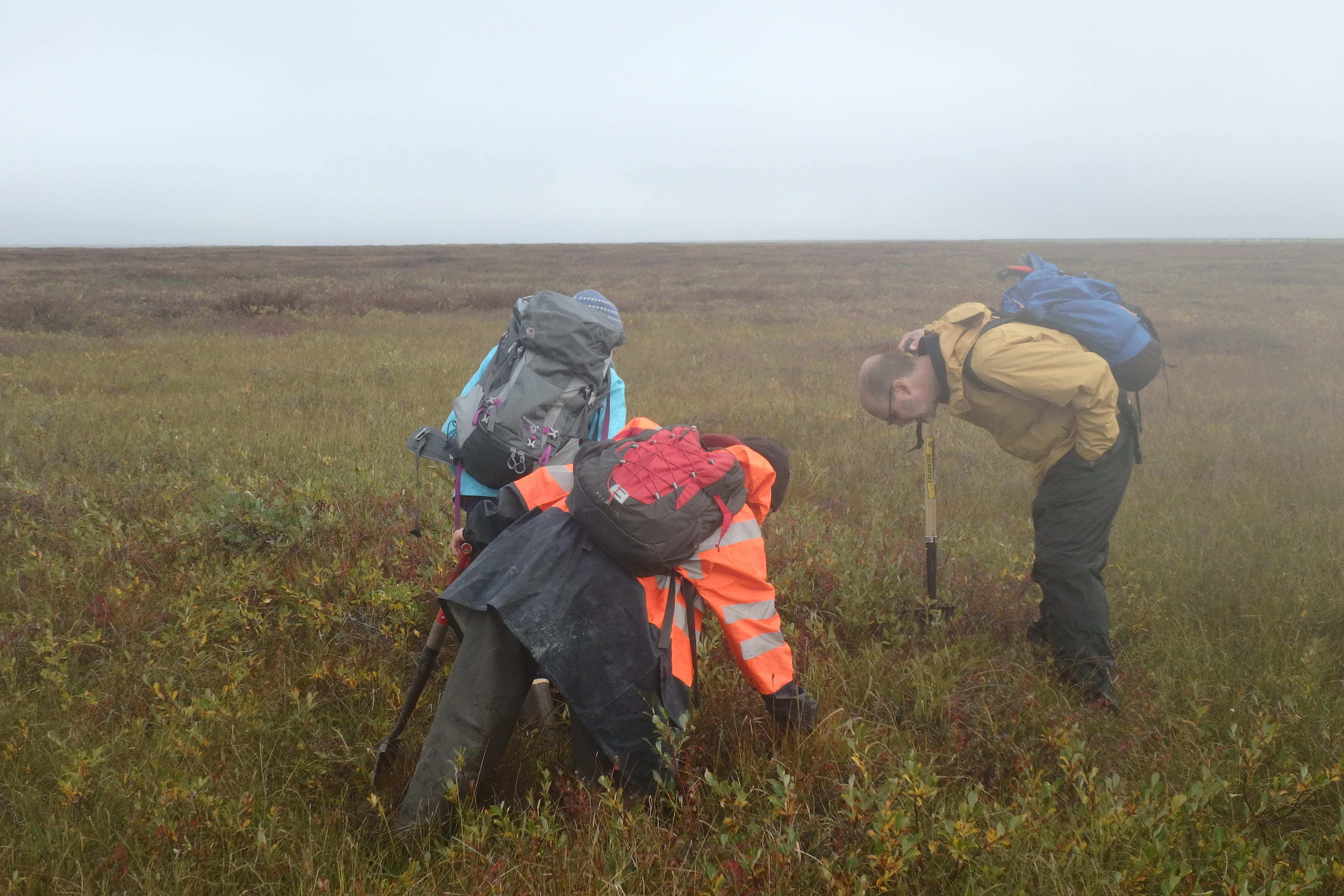 Dr. Becky Hewitt, Dr. Helene Genet and Dr. Lee Taylor examine tundra on the North Slope of Alaska. Nell Kemp: "Three scientists can look at the same section of tundra and notice entirely different things." North Slope, Alaska.