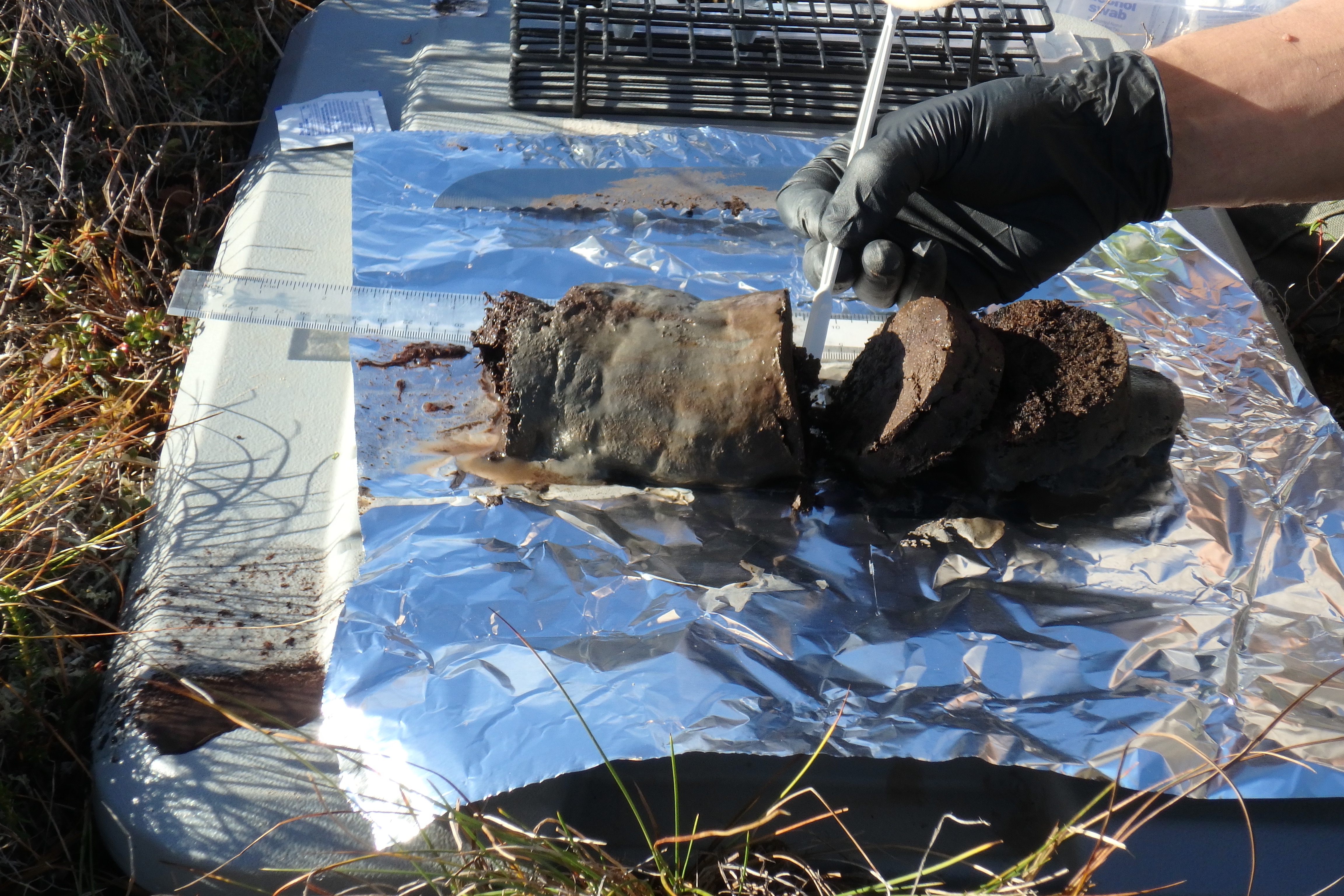 A soil core is sliced and scooped for RNA analysis. Healy, Alaska.