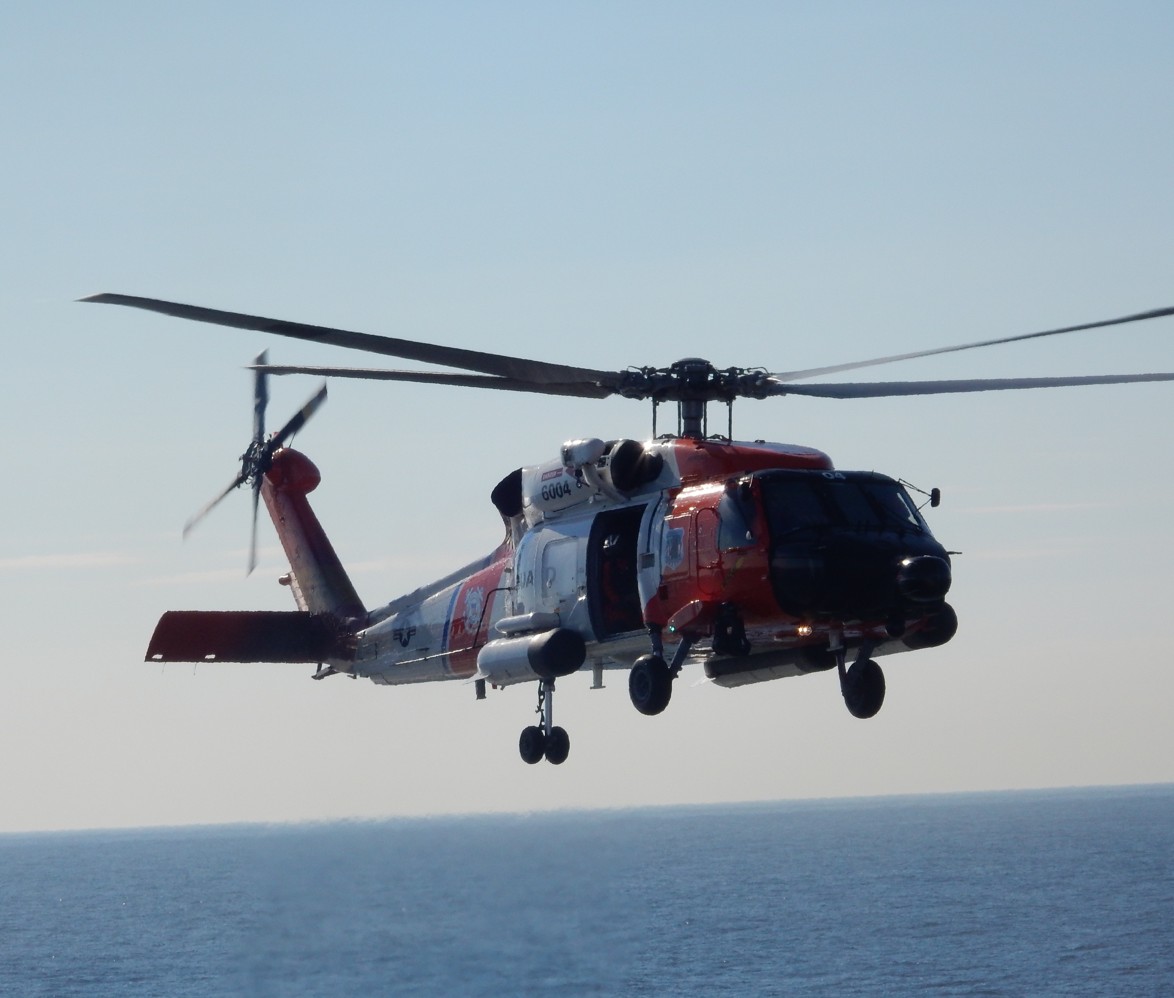 A helicopter practices landings and takeoffs aboard the USCGC Healy icebreaker.
