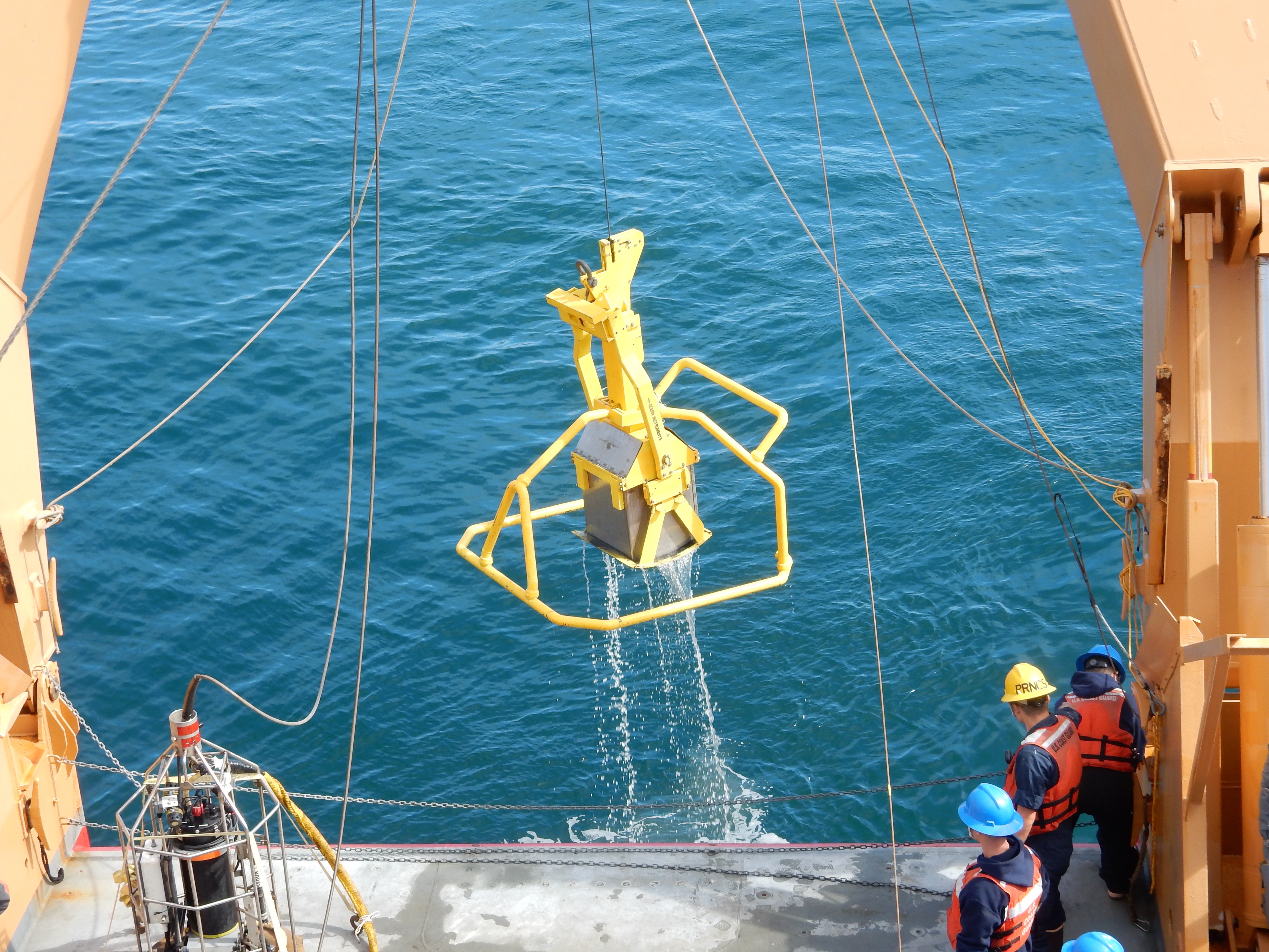 The crew brings in the box corer after a test run. Aboard the USCGC Healy icebreaker in the Bering Sea.