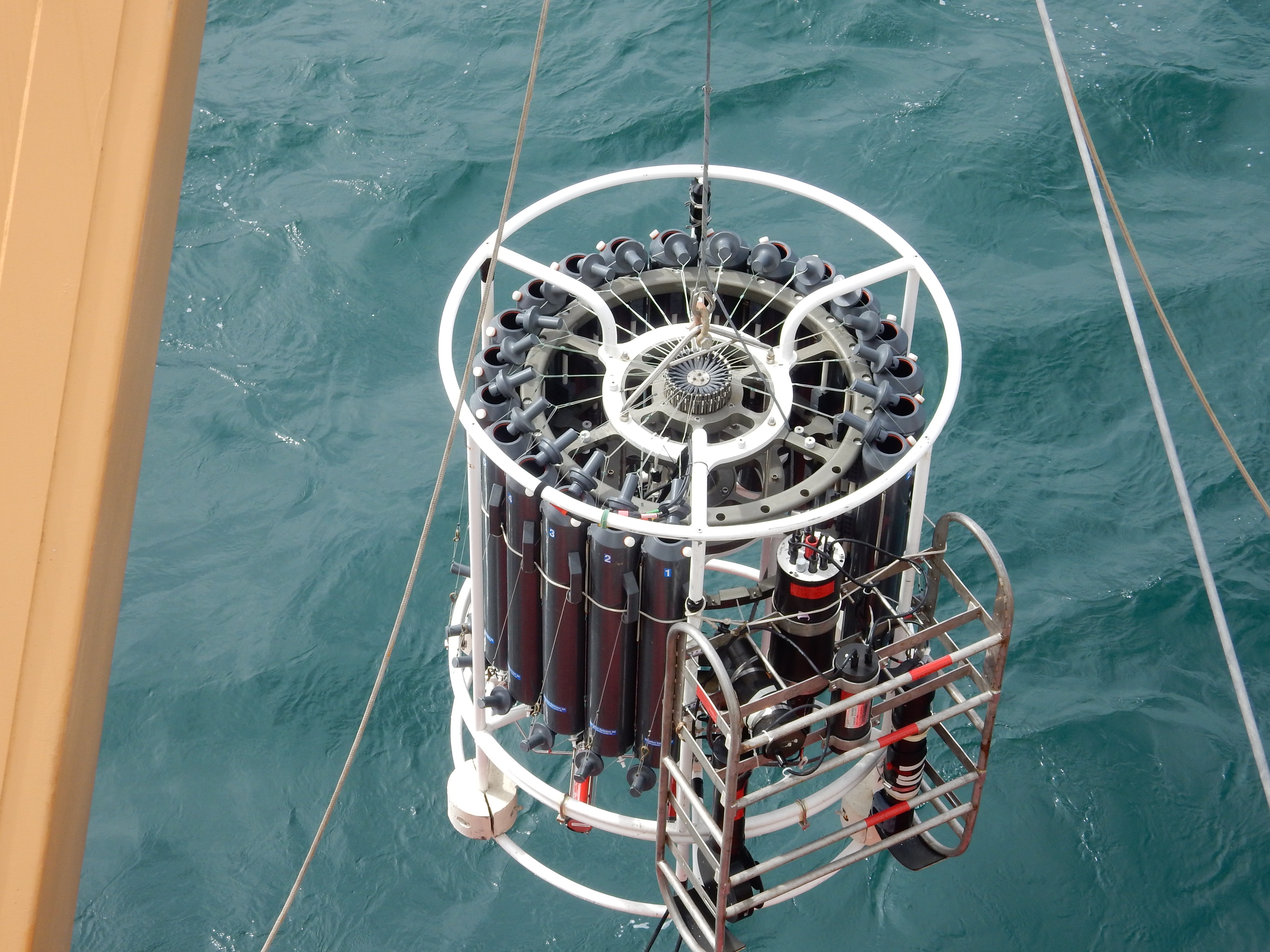 The CTD (conductivity, temperature and depth probe) is brought back on deck after a test run. Aboard the USCGC Healy icebreaker in the Bering Sea.