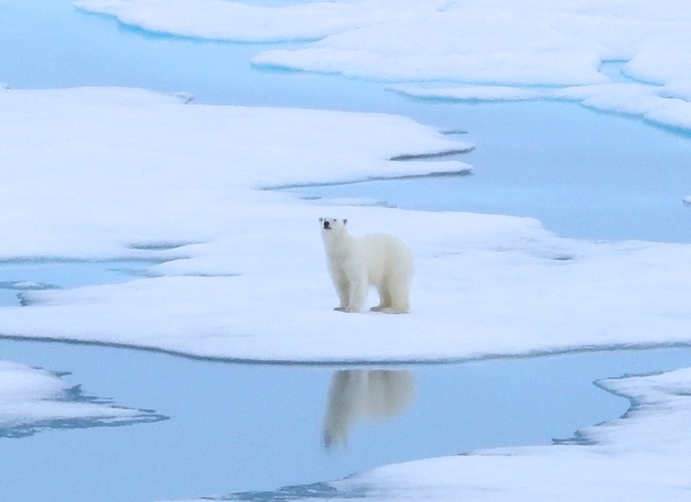 A curious polar bear seen from aboard the USCGC Healy icebreaker in the northern Chukchi Sea.