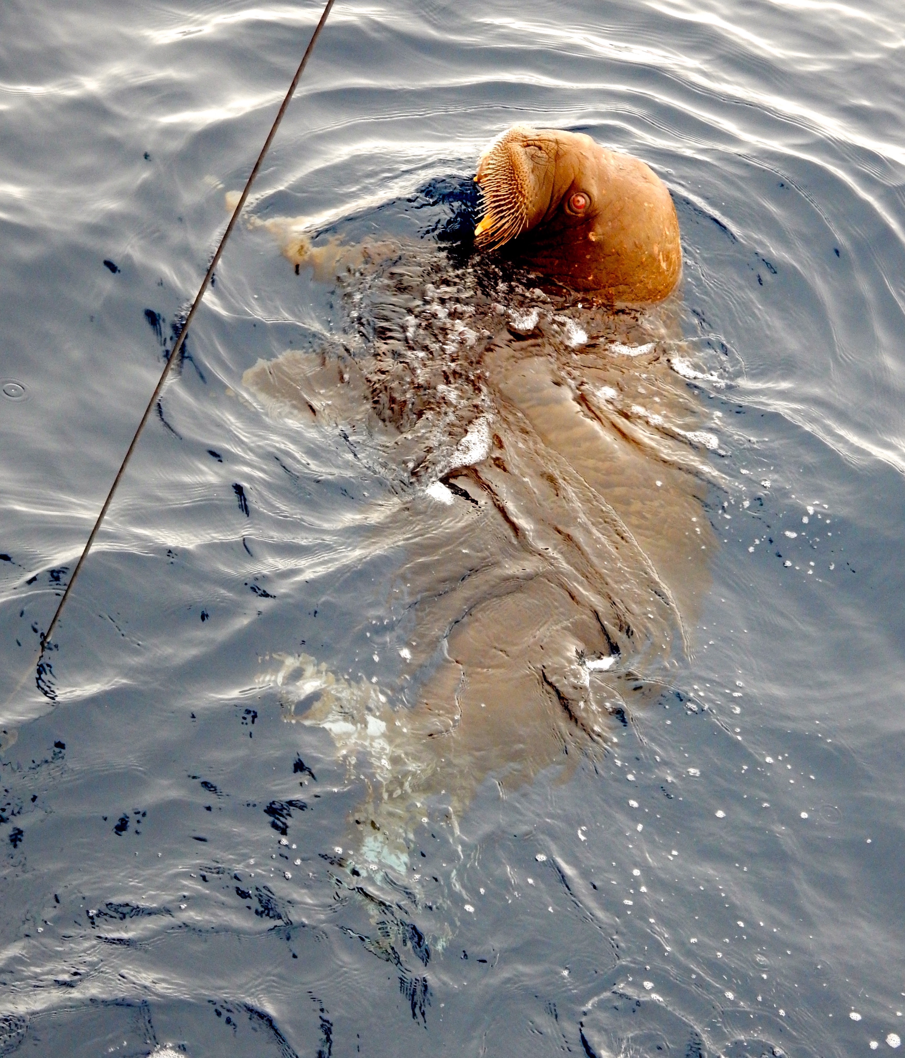 A curious walrus investigates USCGC Healy icebreaker in the northern Chukchi Sea.