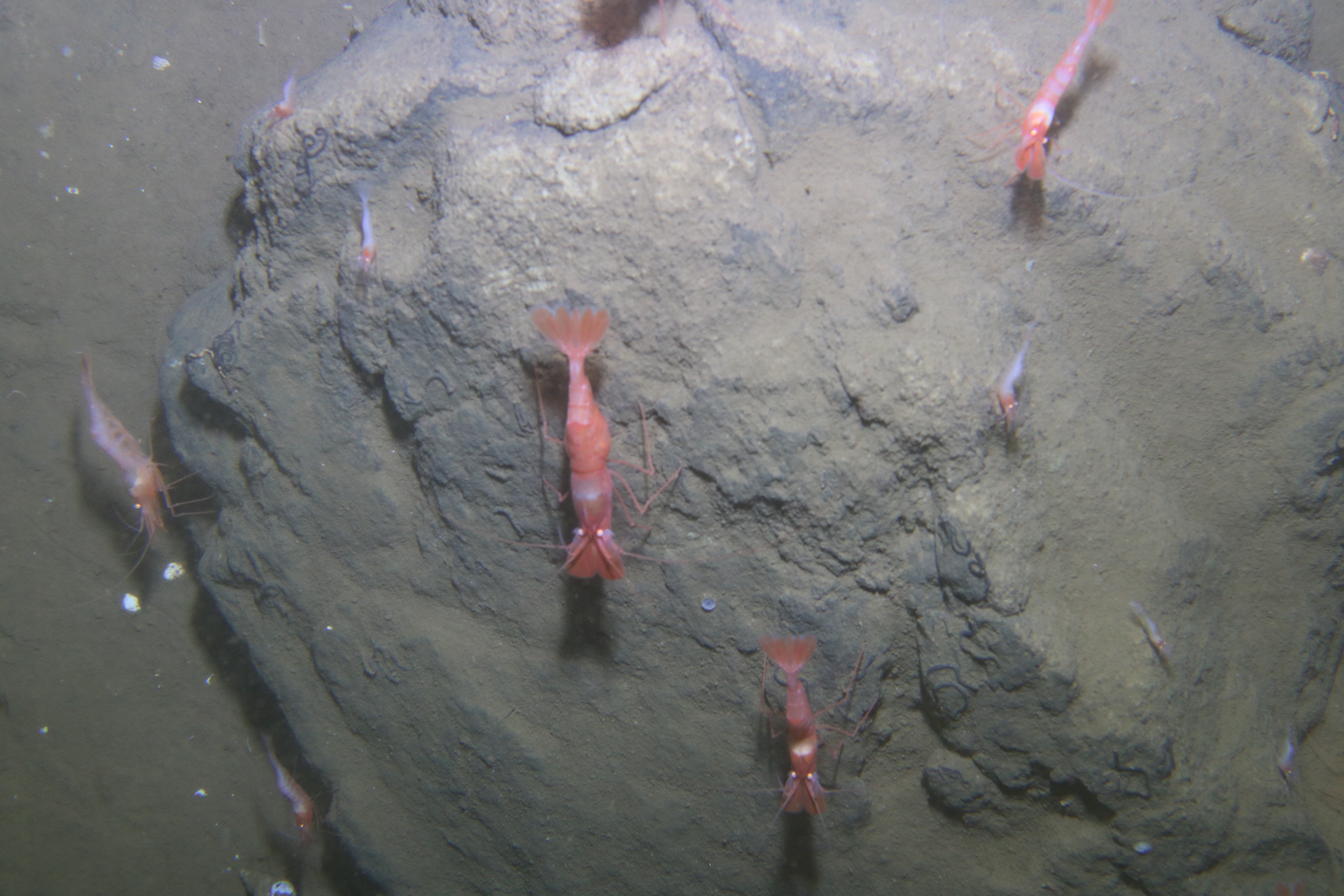 Shrimp clustered around a rock as seen via the remotely operated vehicle (ROV) camera. Aboard the USCGC Healy icebreaker in the northern Chukchi Sea.