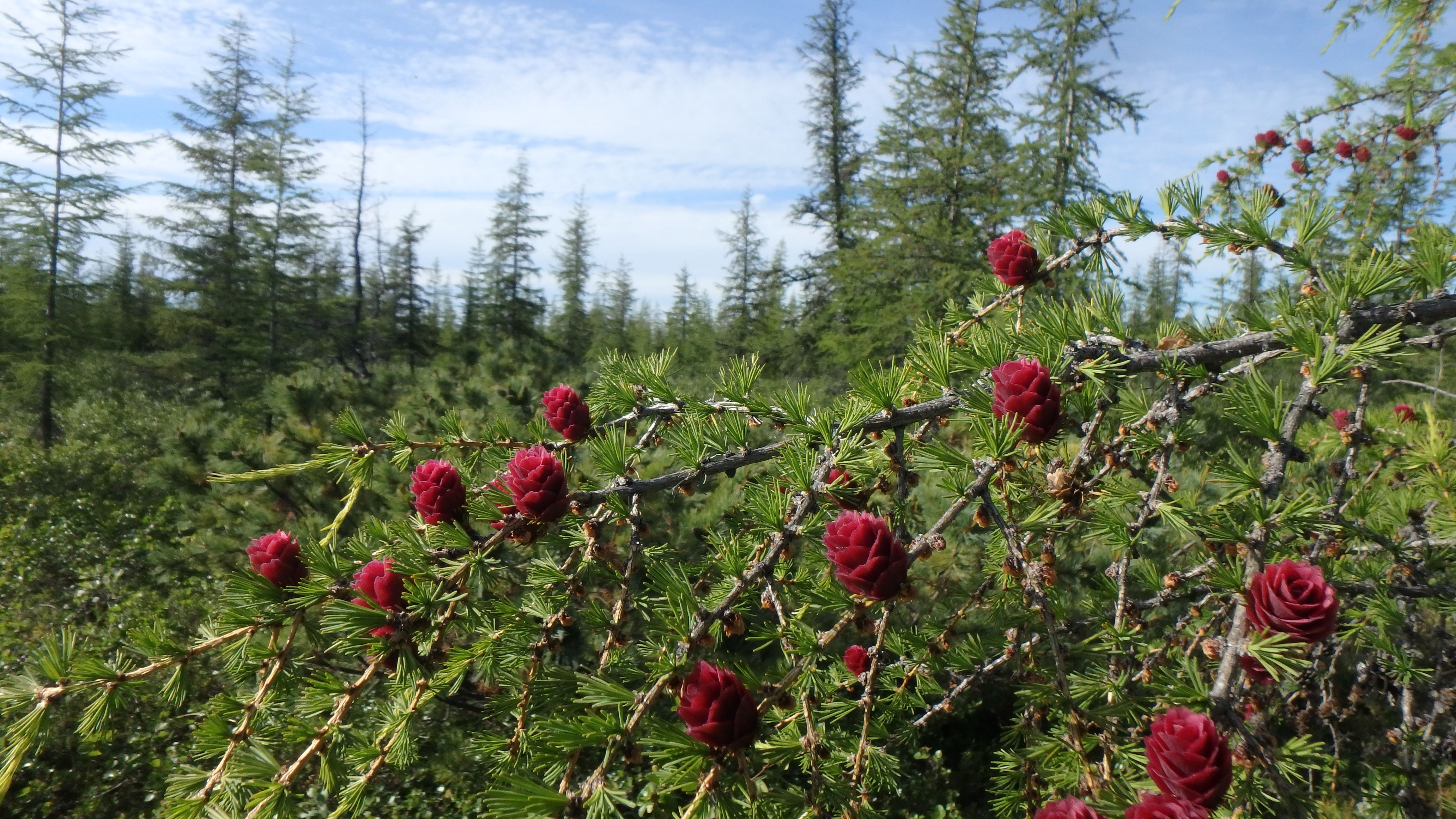 Budding cones of a larch tree in the boreal forest outside of Cherskiy, Russia.
