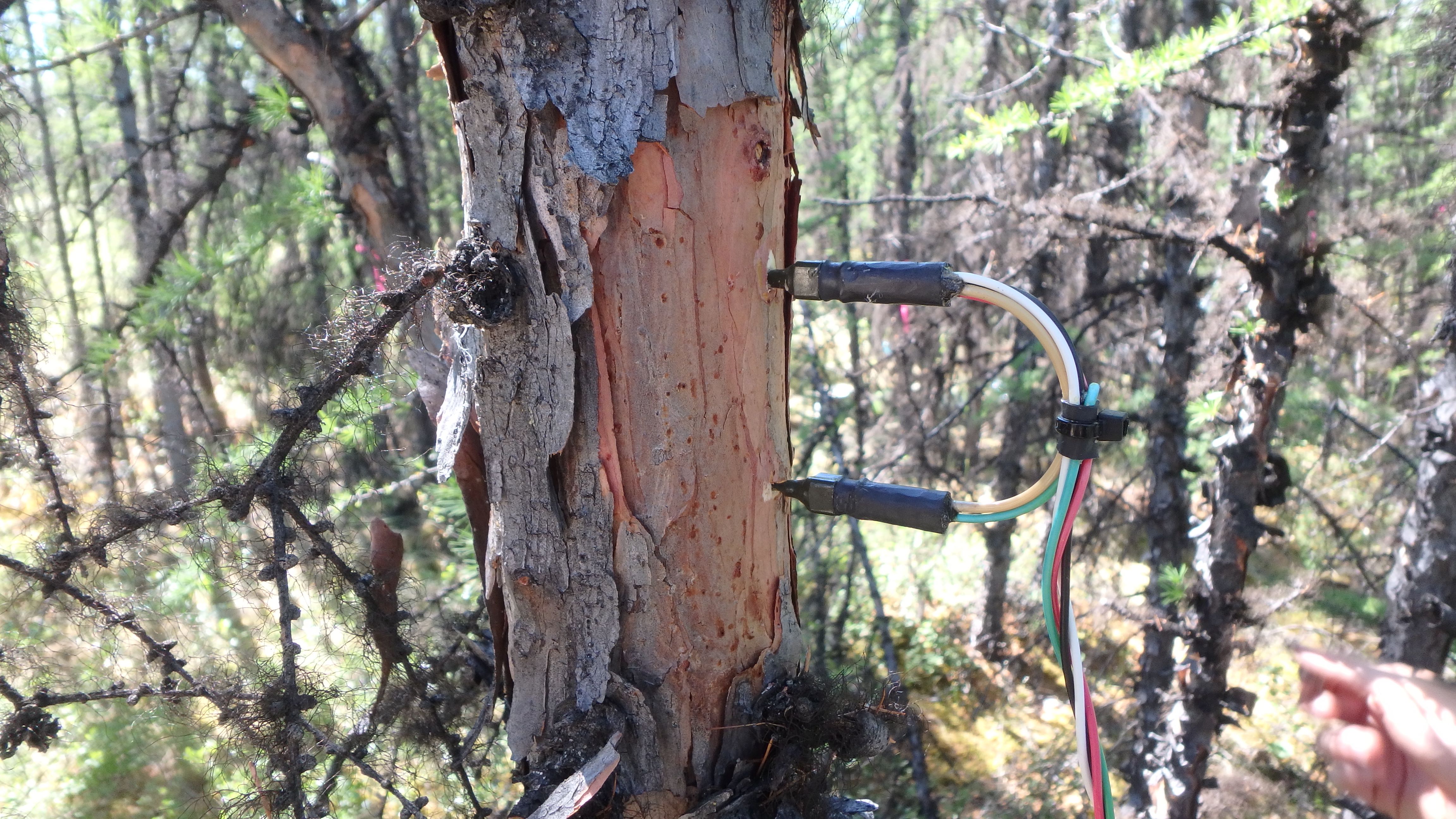 A Thermal Dissipation Probe (TDP) sensor drilled into tree trunks at chest height to measure transpiration by taking the temperature difference across a heated element to determine the amount of sap flow. Outside of Cherskiy, Russia.