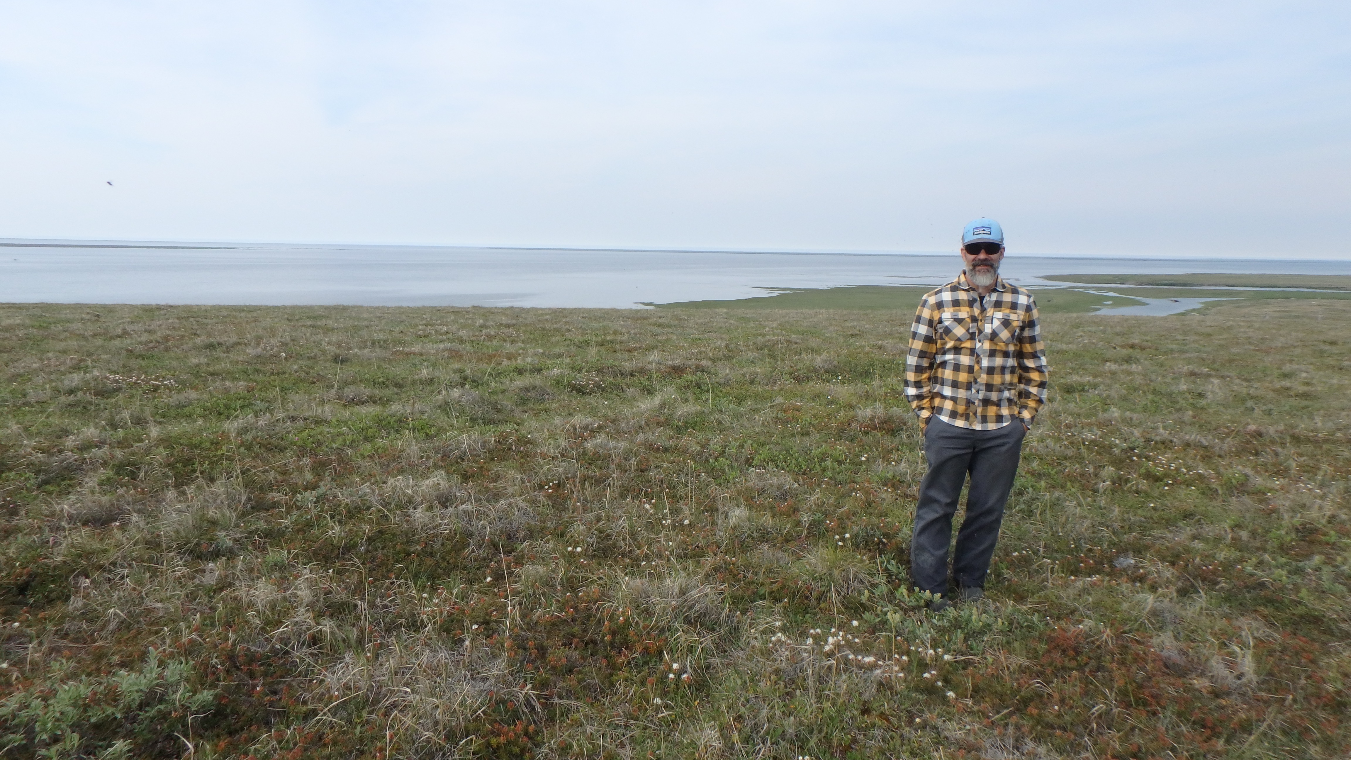 Stan Skotnicki stands on the tundra with the Kolyma River and the Arctic ocean in the background. Outside of Cherskiy, Russia.