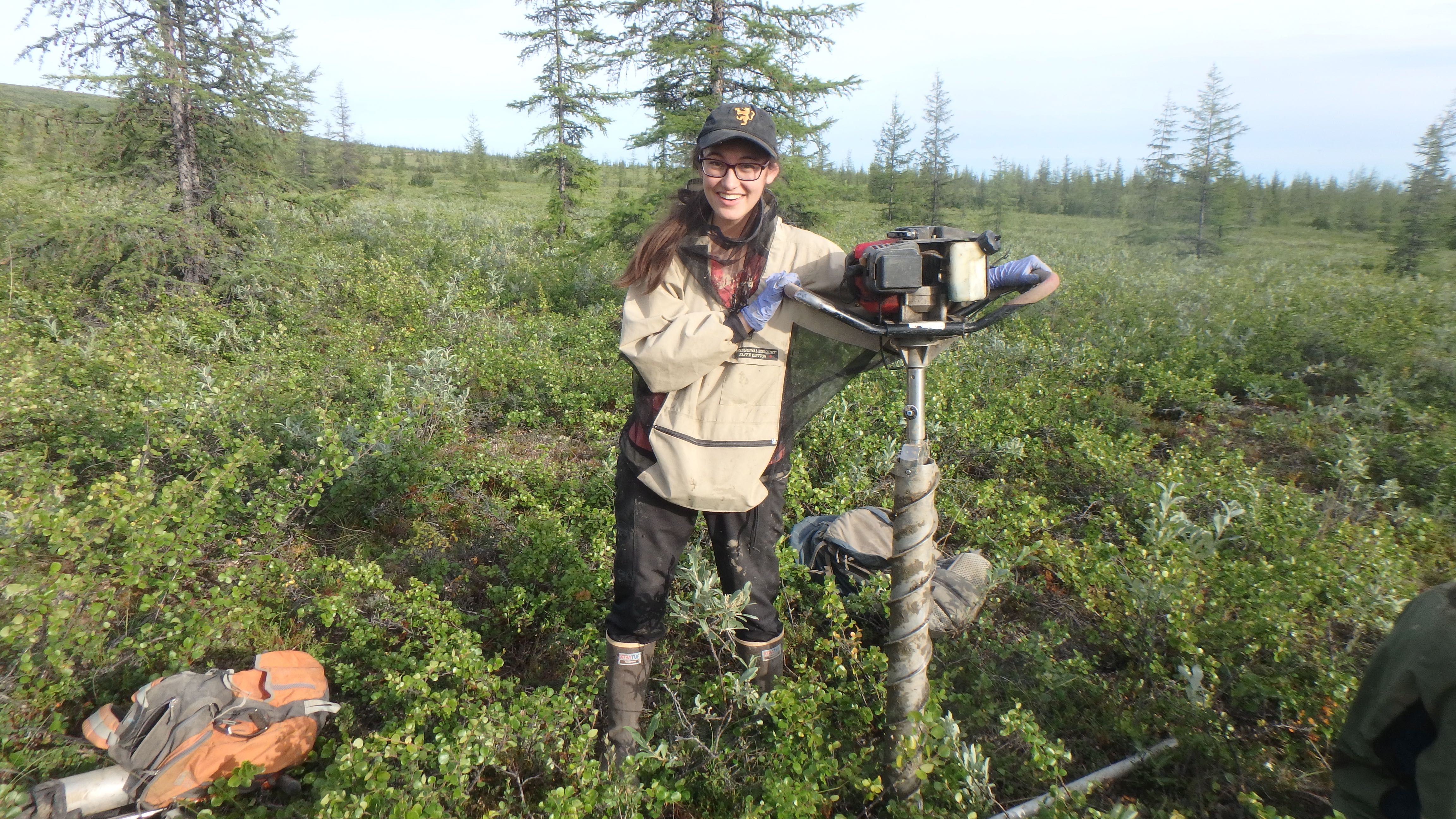 Corey Ruder displays a fully assembled ice core drill. Outside of Cherskiy, Russia.