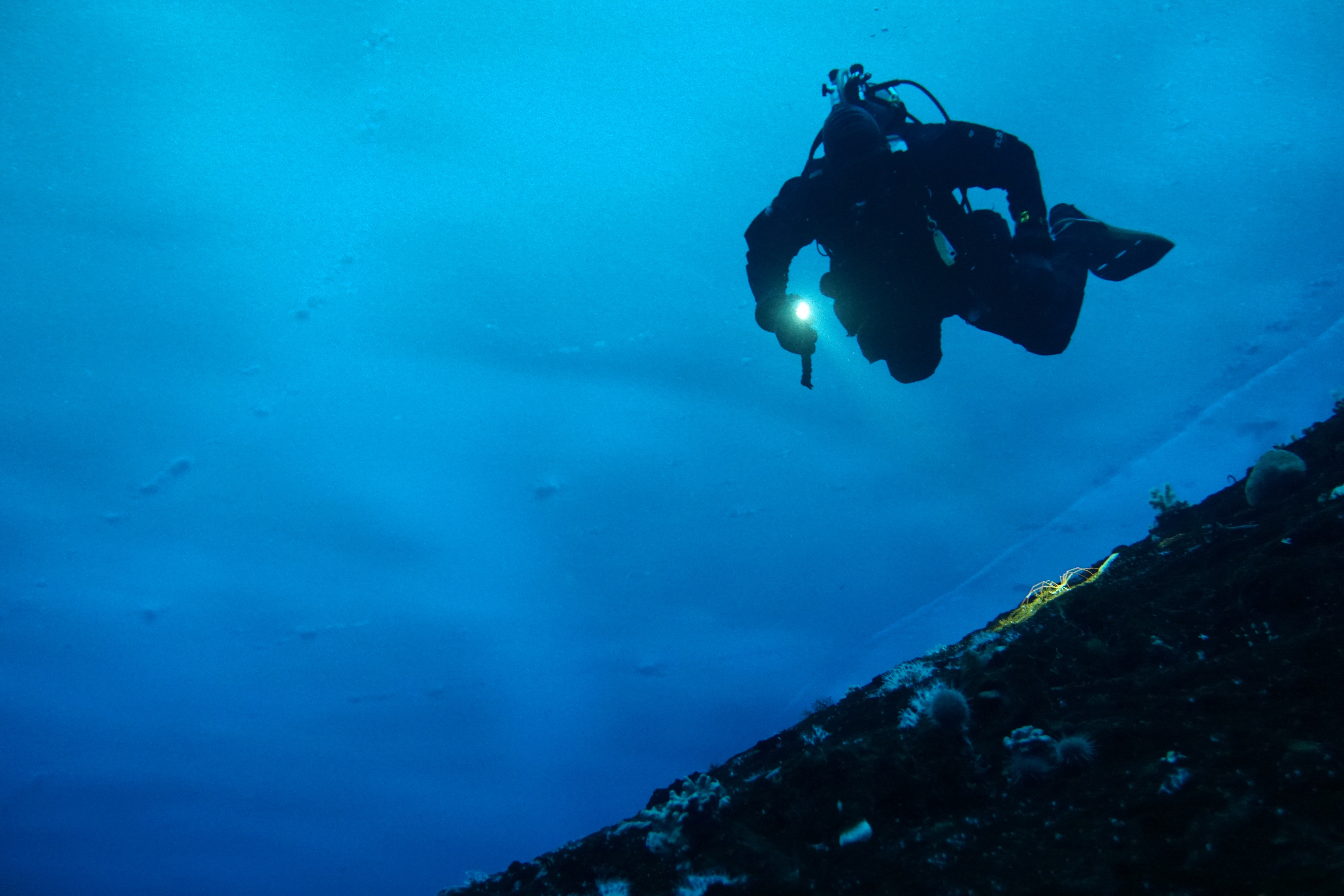 Steve Rupp spots a pycnogonid specimen to bring back to the lab. Turtle Rock, Antarctica.