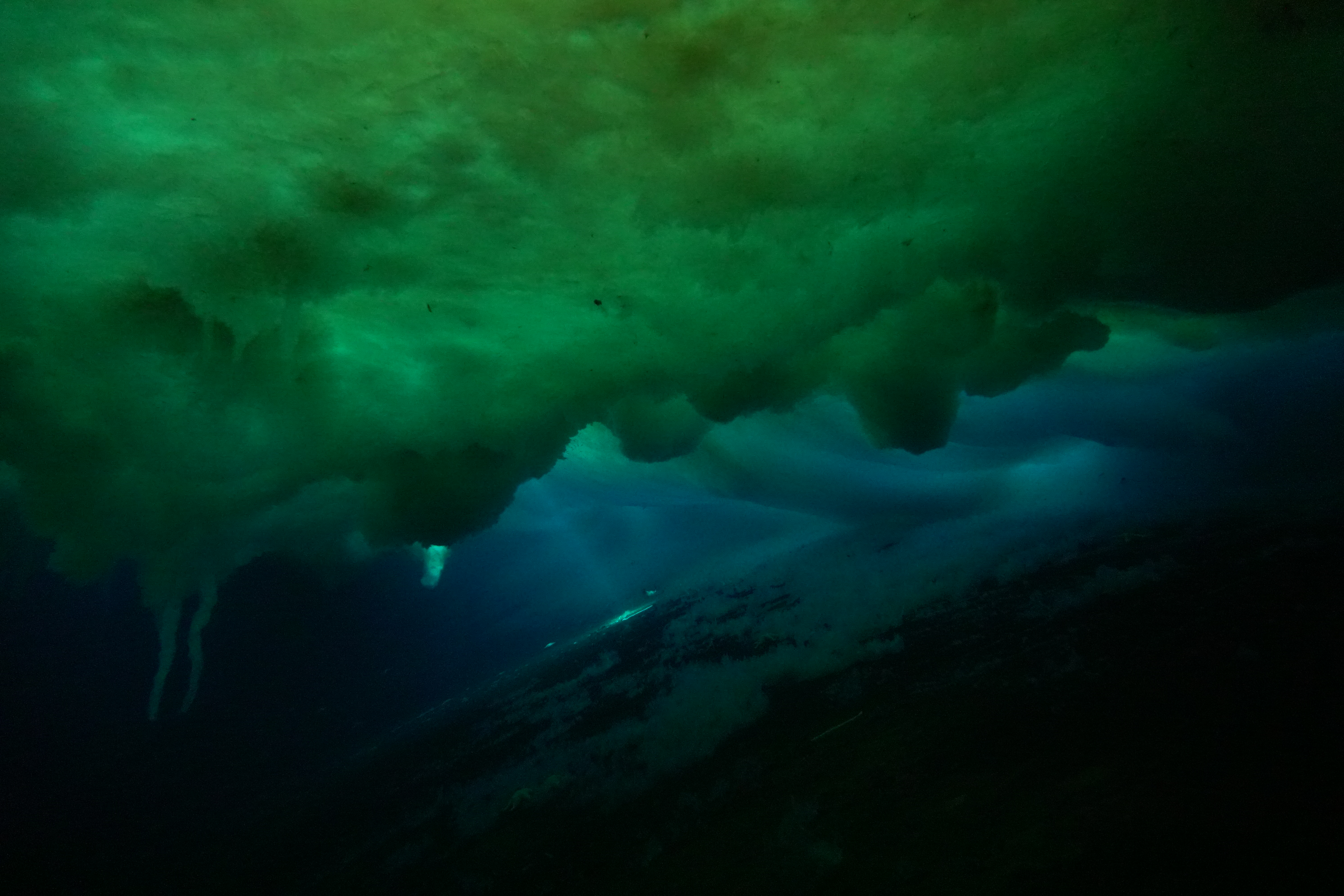 A light leak from a hole in the pressure ridge highlights the sea floor below. Turtle Rock, Antarctica.