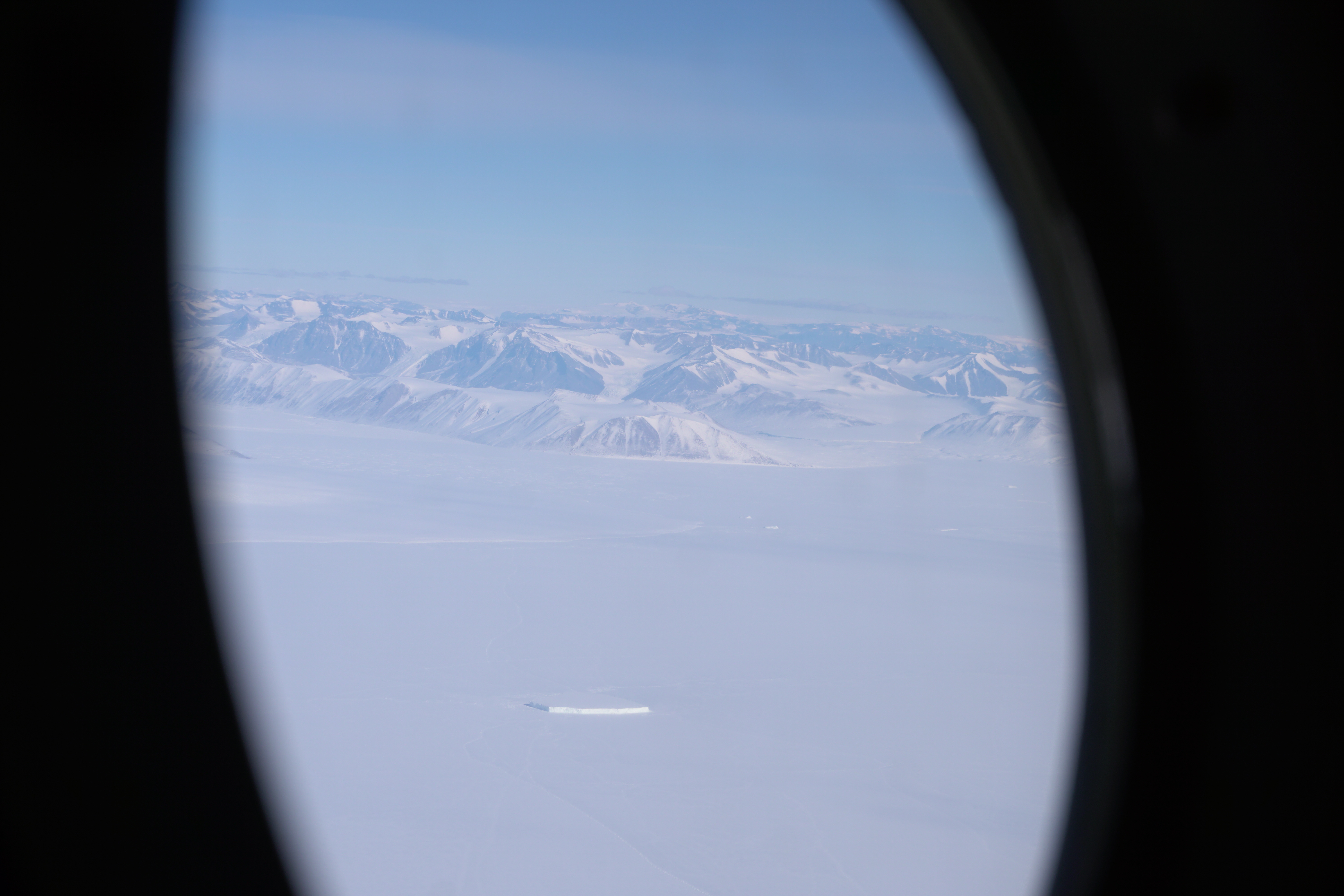 The Transantarctic Mountains serve as a backdrop for a lone tabular iceberg. Aboard a C-130, north of McMurdo Station, Antarctica.