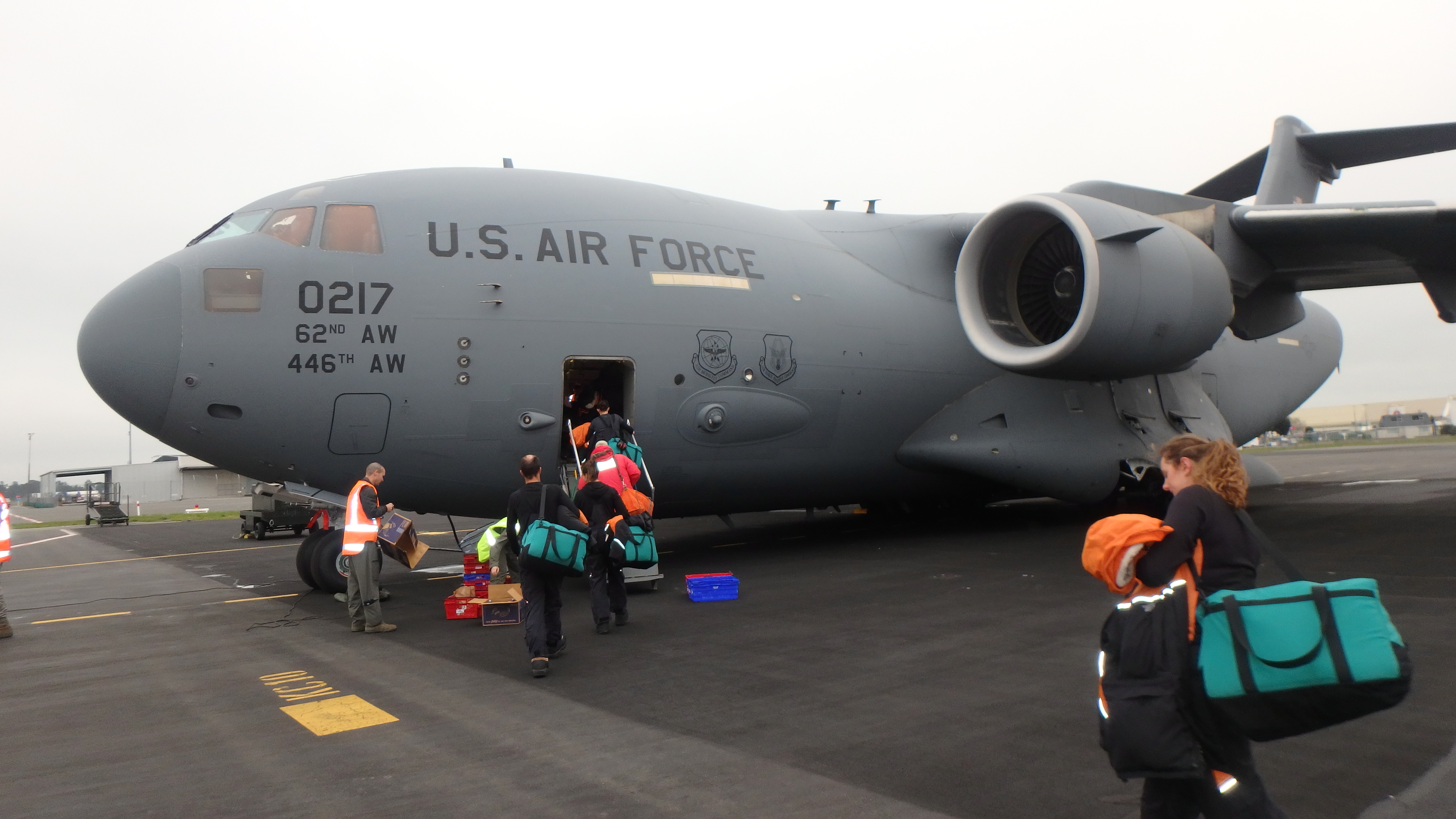 The C-17 Globemaster III is the four engine jet that Operation Deep Freeze uses to transport personnel and material to McMurdo Station. Christchurch, New Zealand.