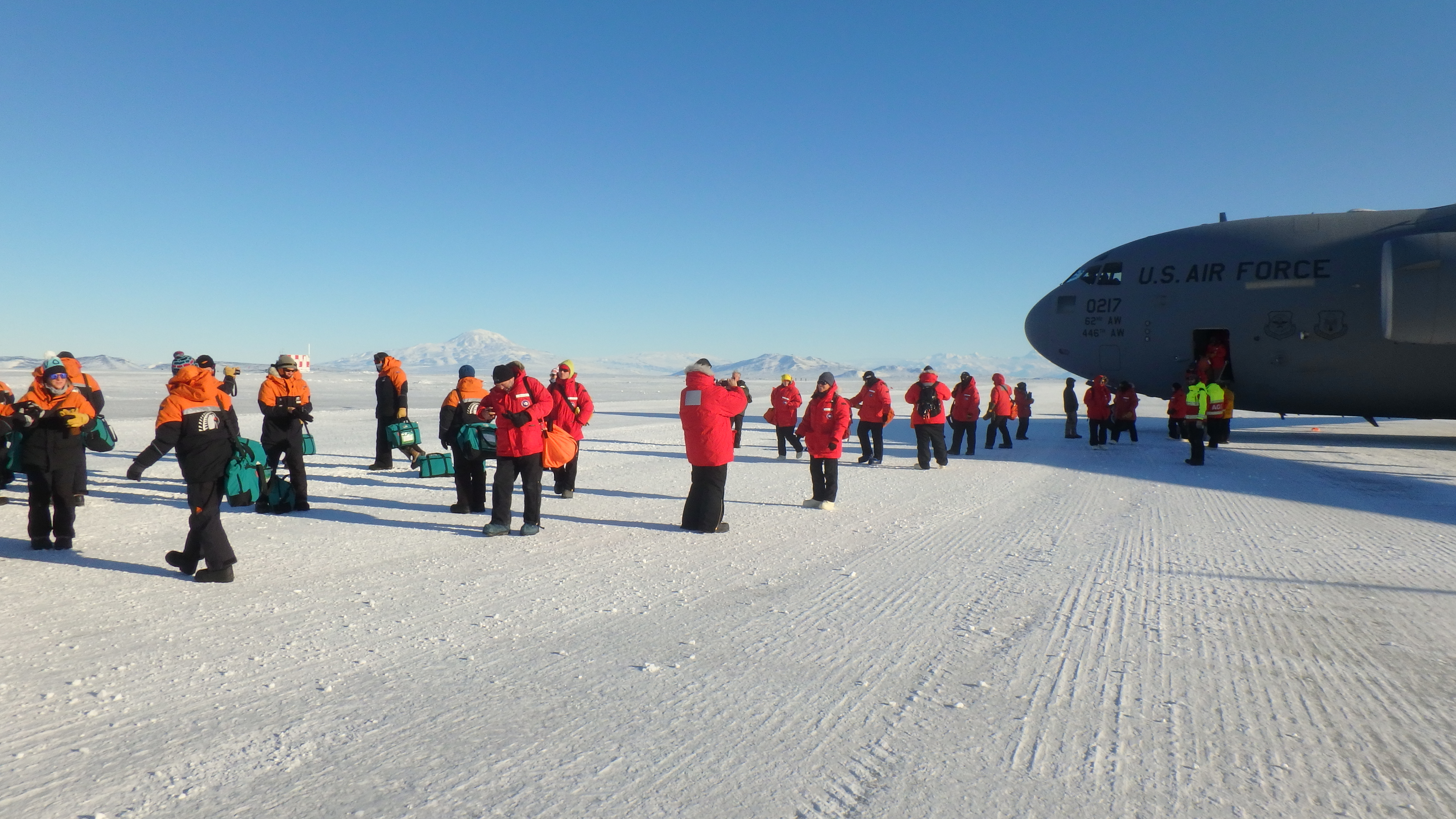 United States Antarctic Program (USAP) and Antarctica New Zealand participants disembark the C-17. Pegasus Field, near McMurdo Station, Antarctica.