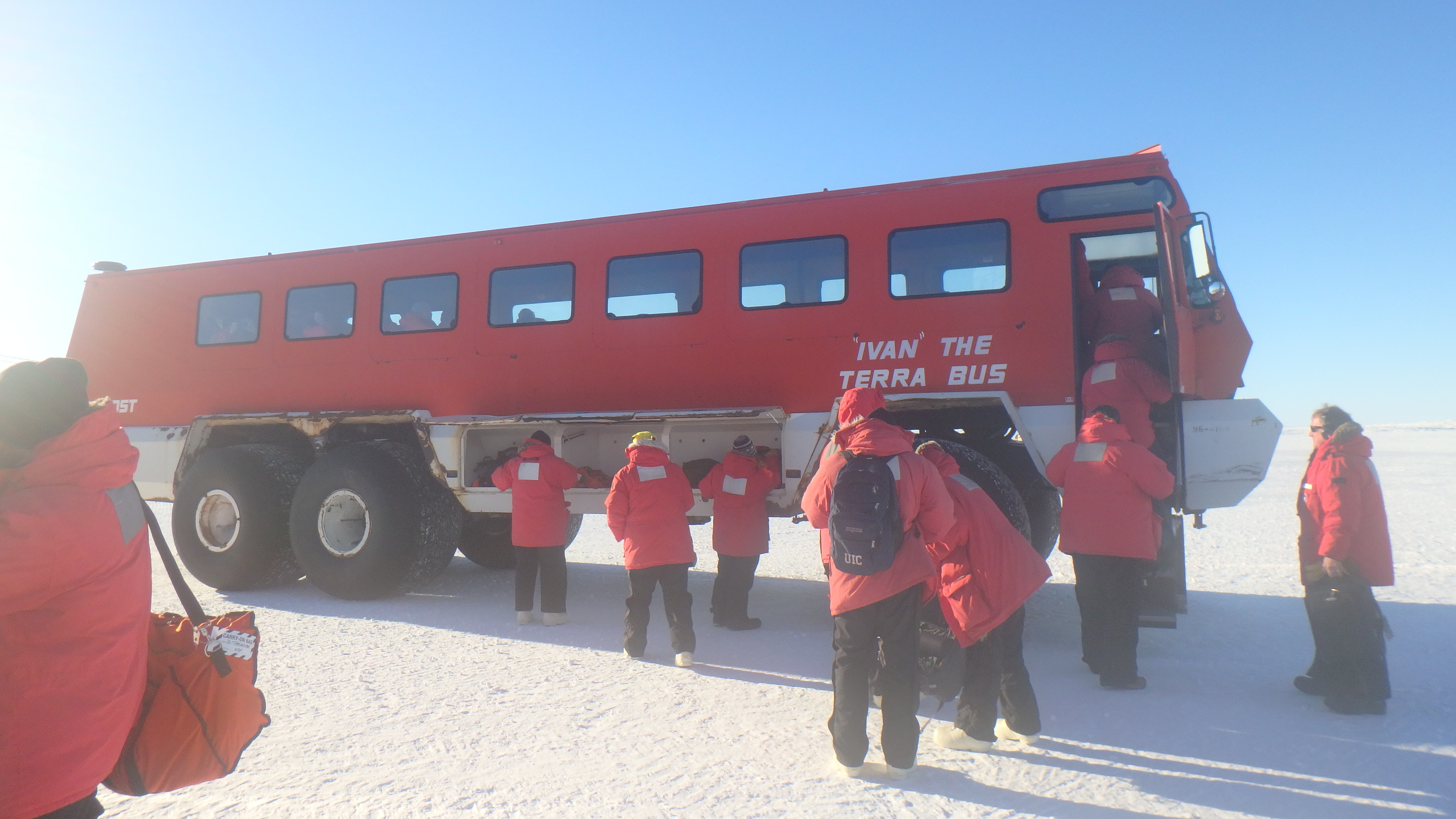 Massive ground transports are required to move large numbers of people along the snow road back to McMurdo Station. Pegasus Field, near McMurdo Station, Antarctica.