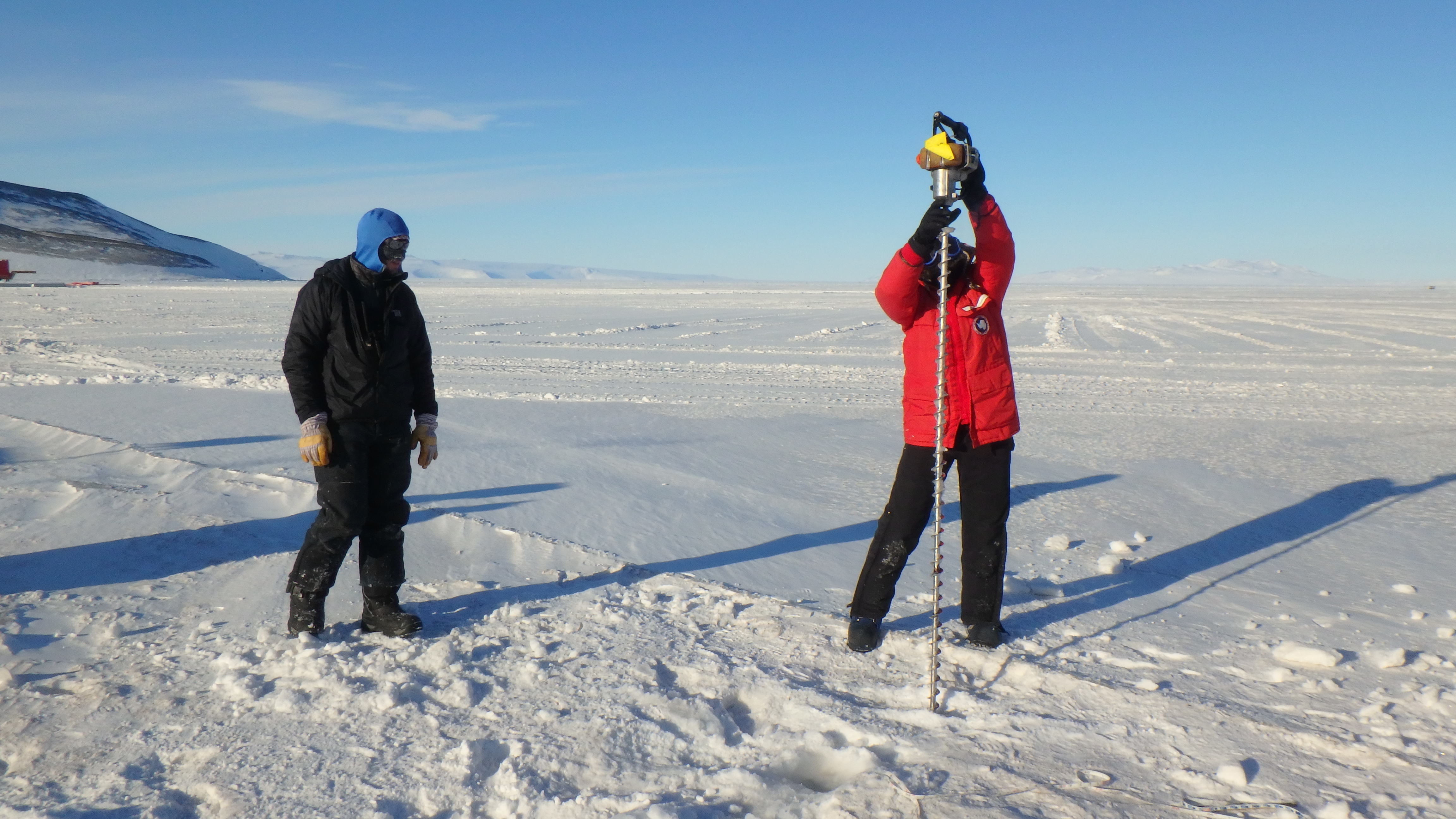 Ben Atkison instructs a course participant in proper sea ice drilling technique. McMurdo Station, Antarctica.