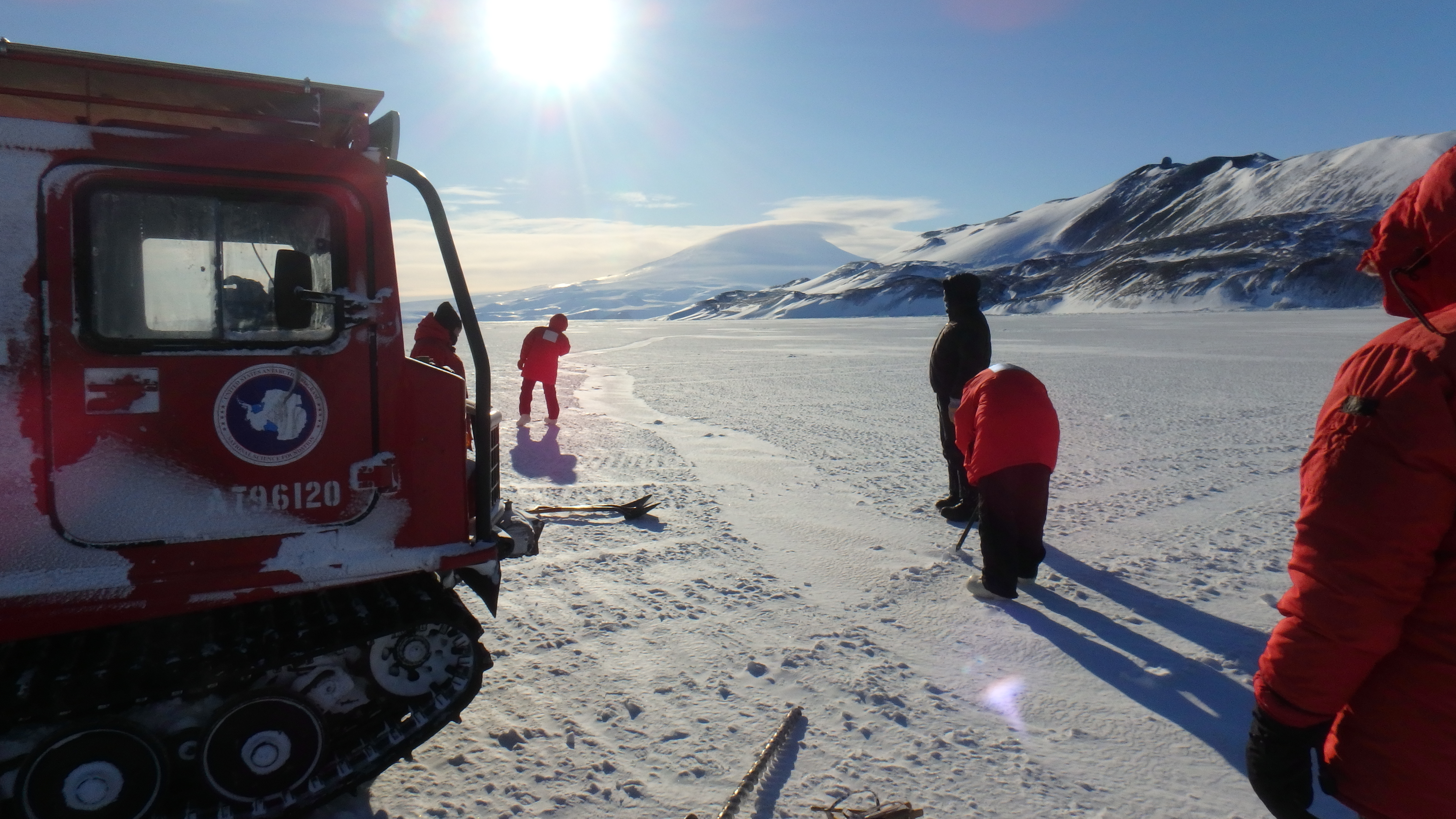 Course participants prepare to evaluate a sea ice crack. McMurdo Station, Antarctica.