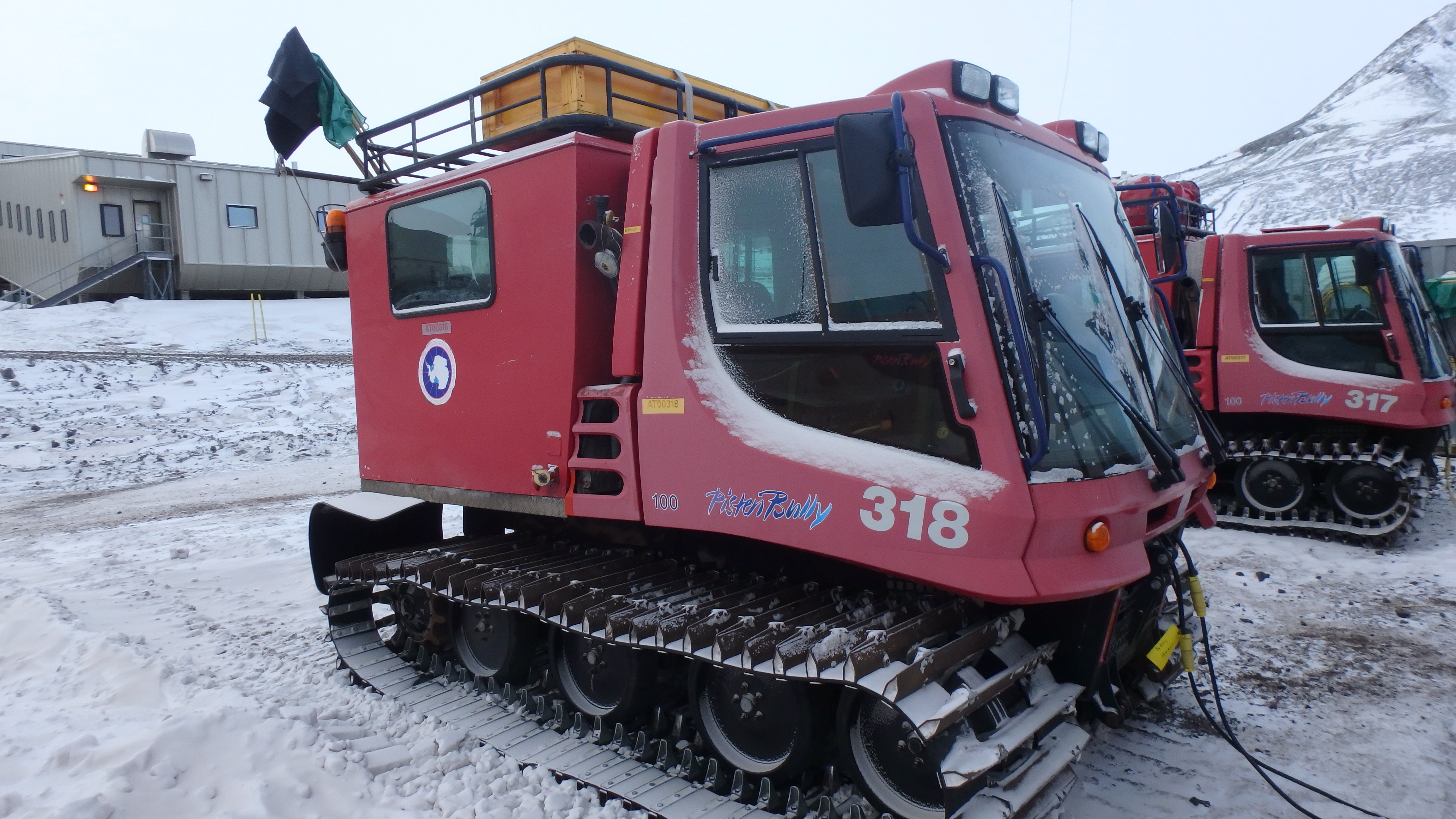Though a little clumsy on land, the rubber tracks on PistenBullys make them ideal vehicles for cross-ice transport. McMurdo Station, Antarctica.