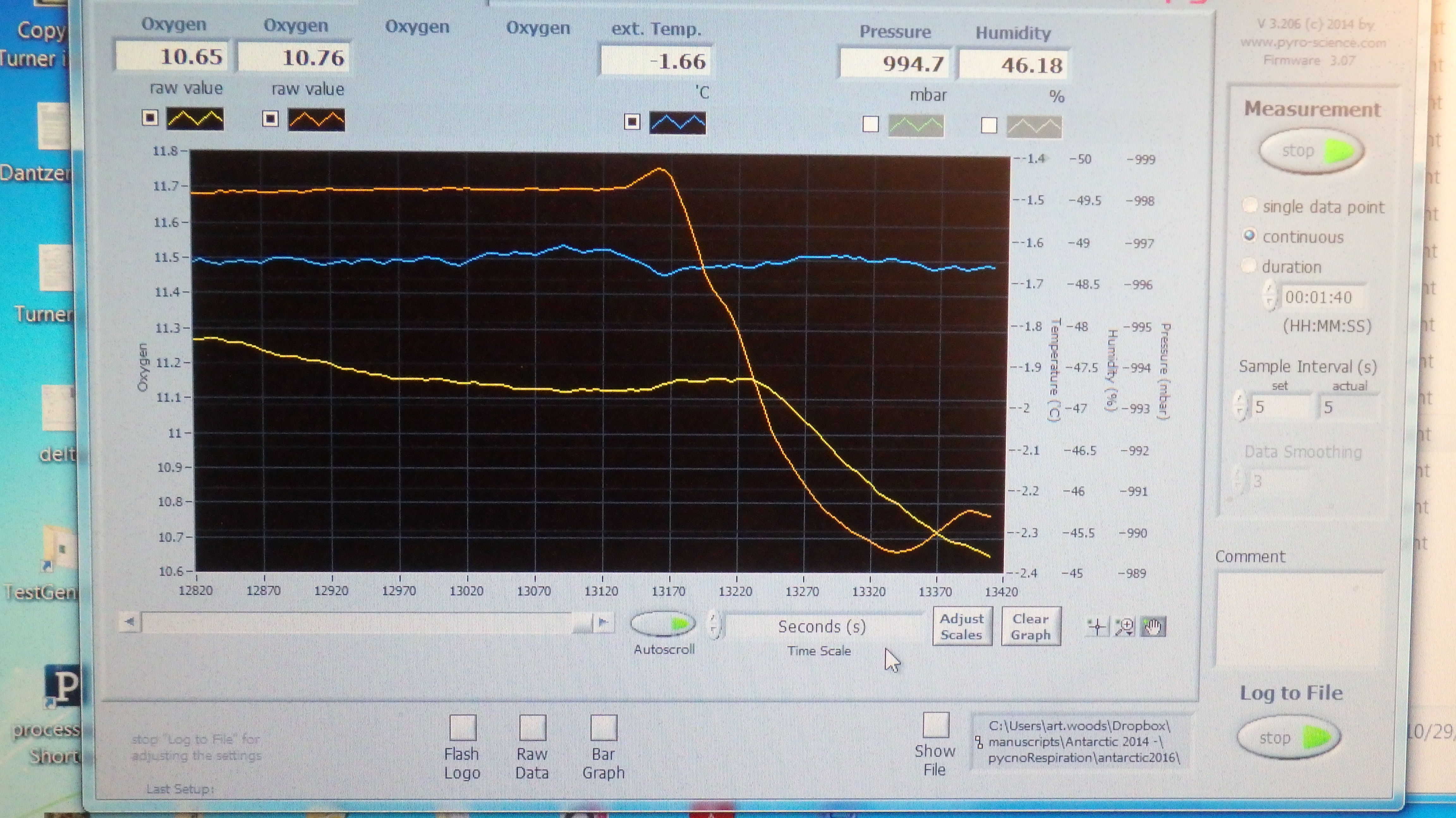 By measuring the slope of lines in oxygen traces, the team can see how metabolism changes under different oxygen conditions. McMurdo Station, Antarctica.