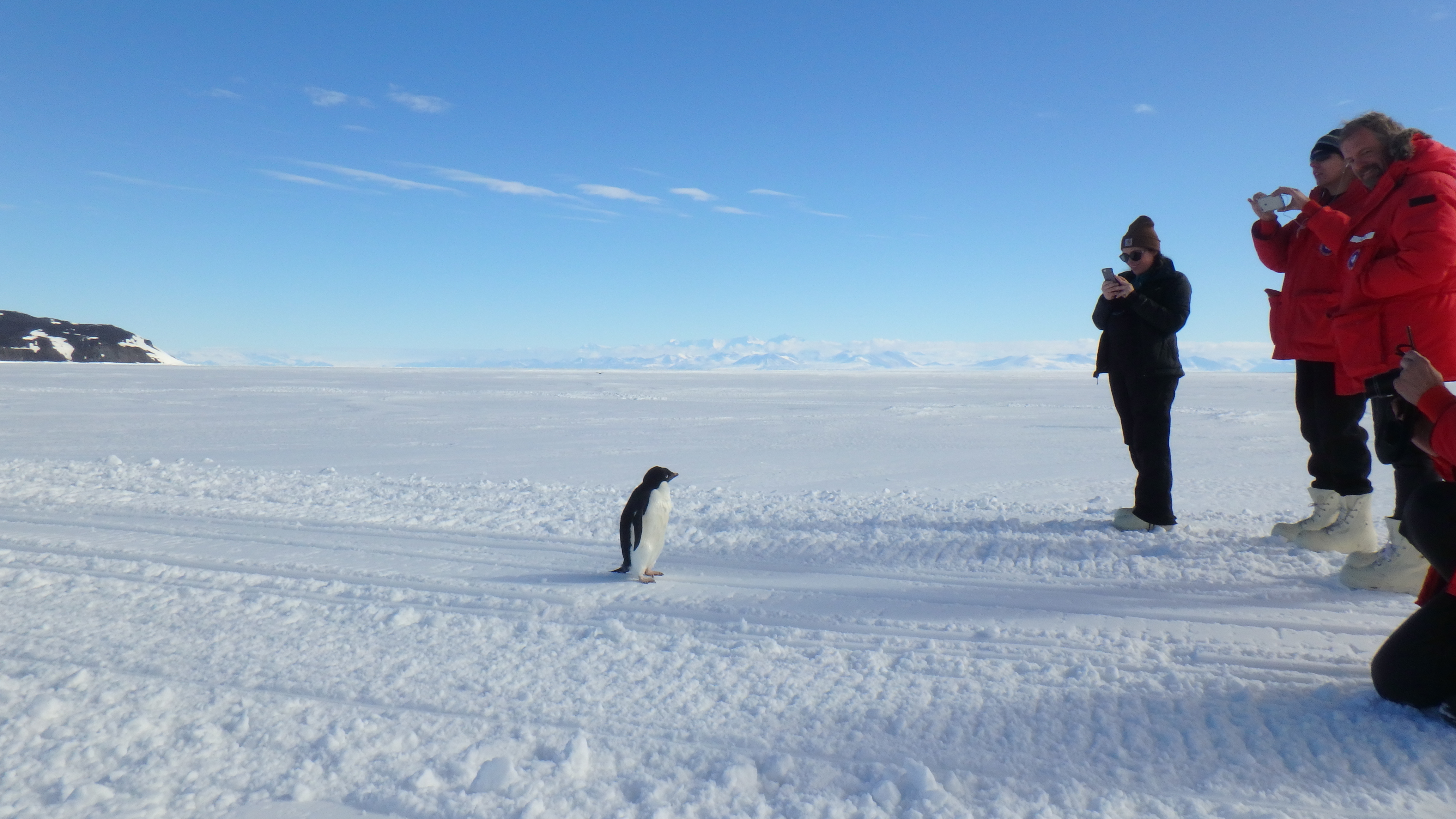Timothy Dwyer: "Adélie penguins often wander right up to vehicles and people, unfamiliar shapes out on the sea ice." McMurdo Station, Antarctica.
