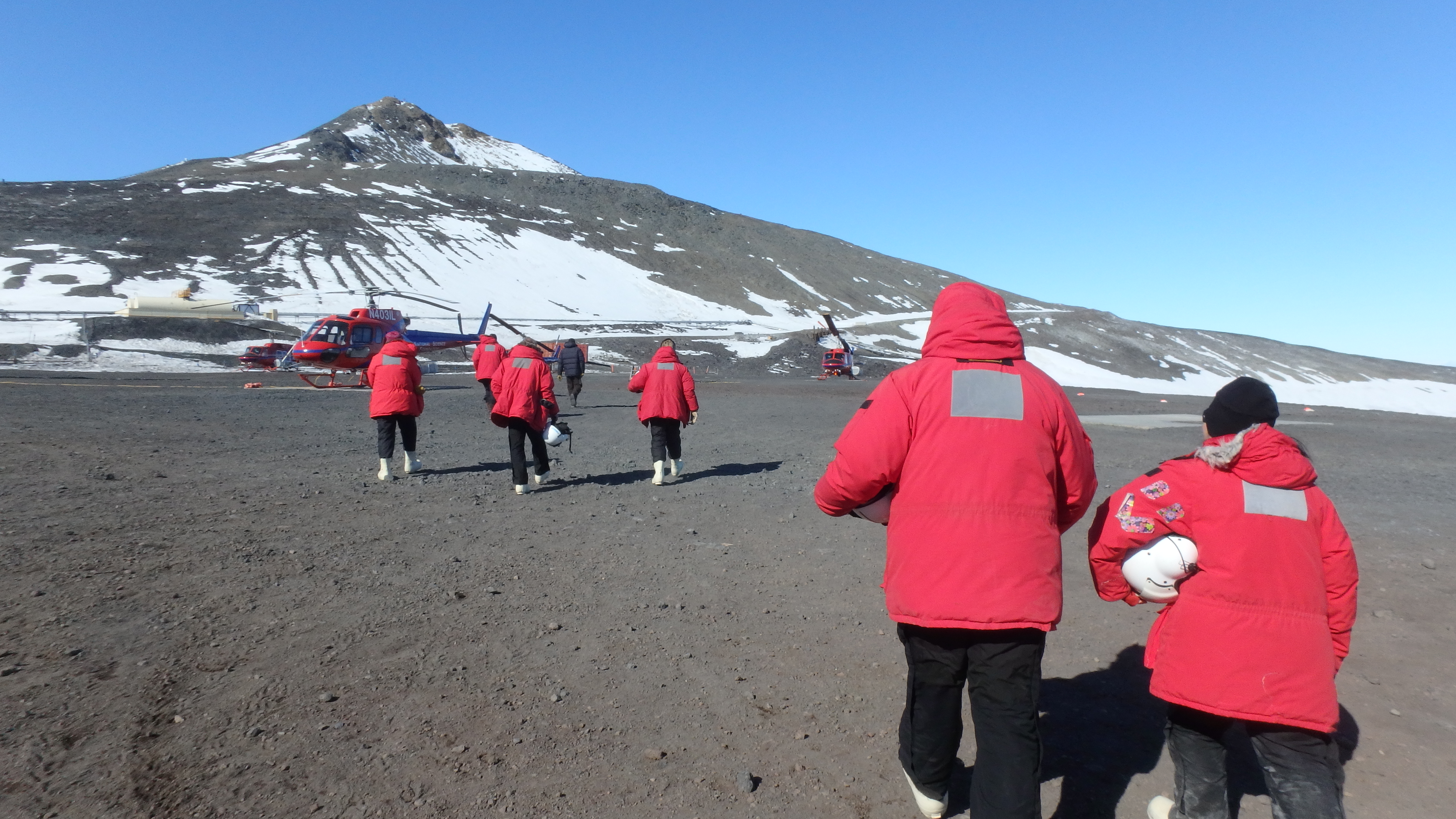 The team is lead out to their waiting Bell 212 "Twin Huey" helicopters for their flight to Granite Harbor. McMurdo Station, Antarctica.