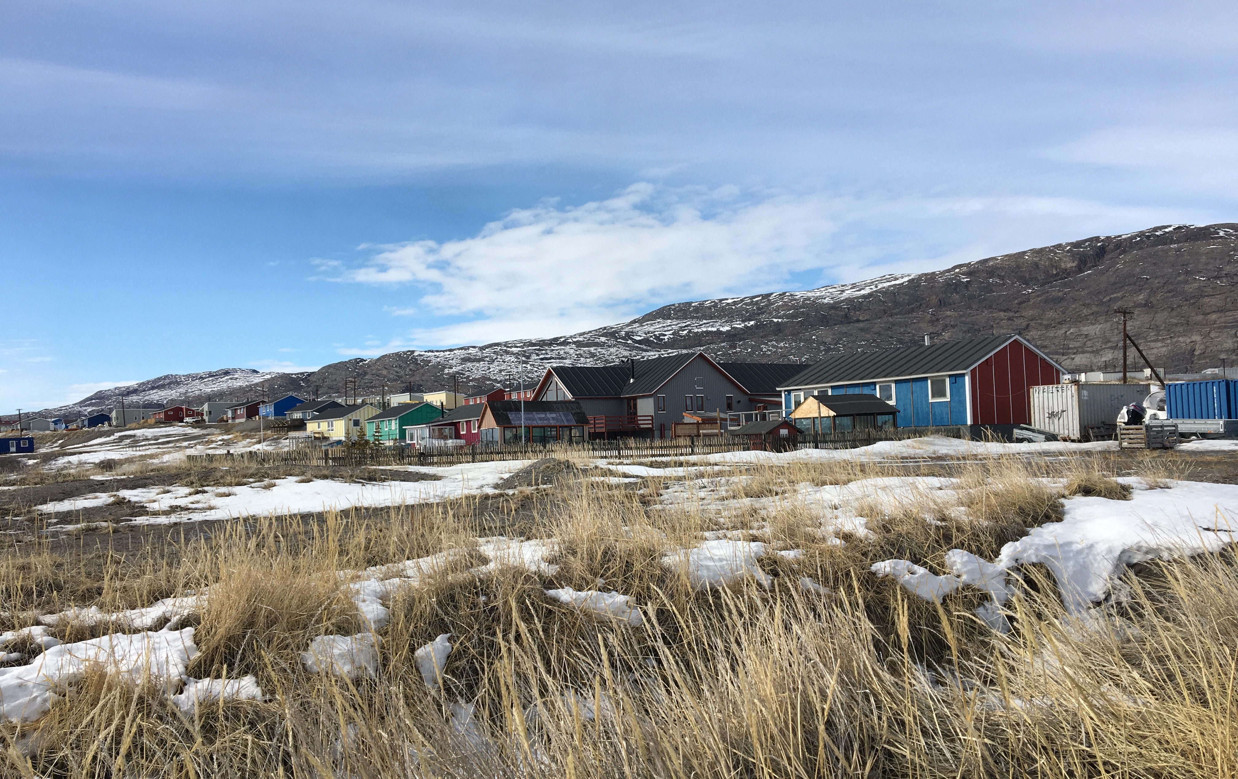 A row of colorful buildings and homes in the town of Kangerlussuaq, Greenland.
