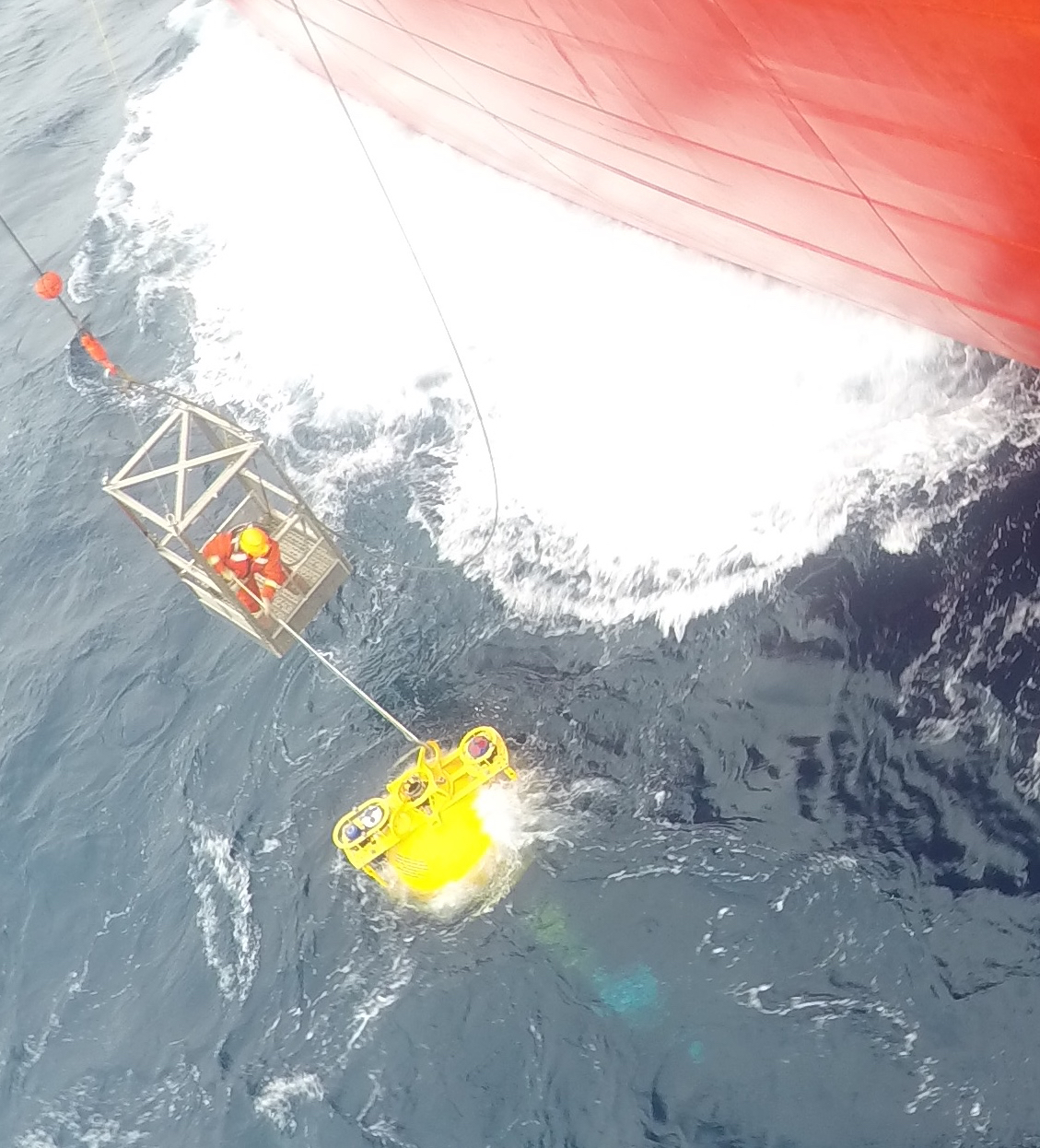 A deckhand attaches the retrieval hook on a mooring buoy. Aboard the CCGS Louis S. St-Laurent in the Beaufort Sea.