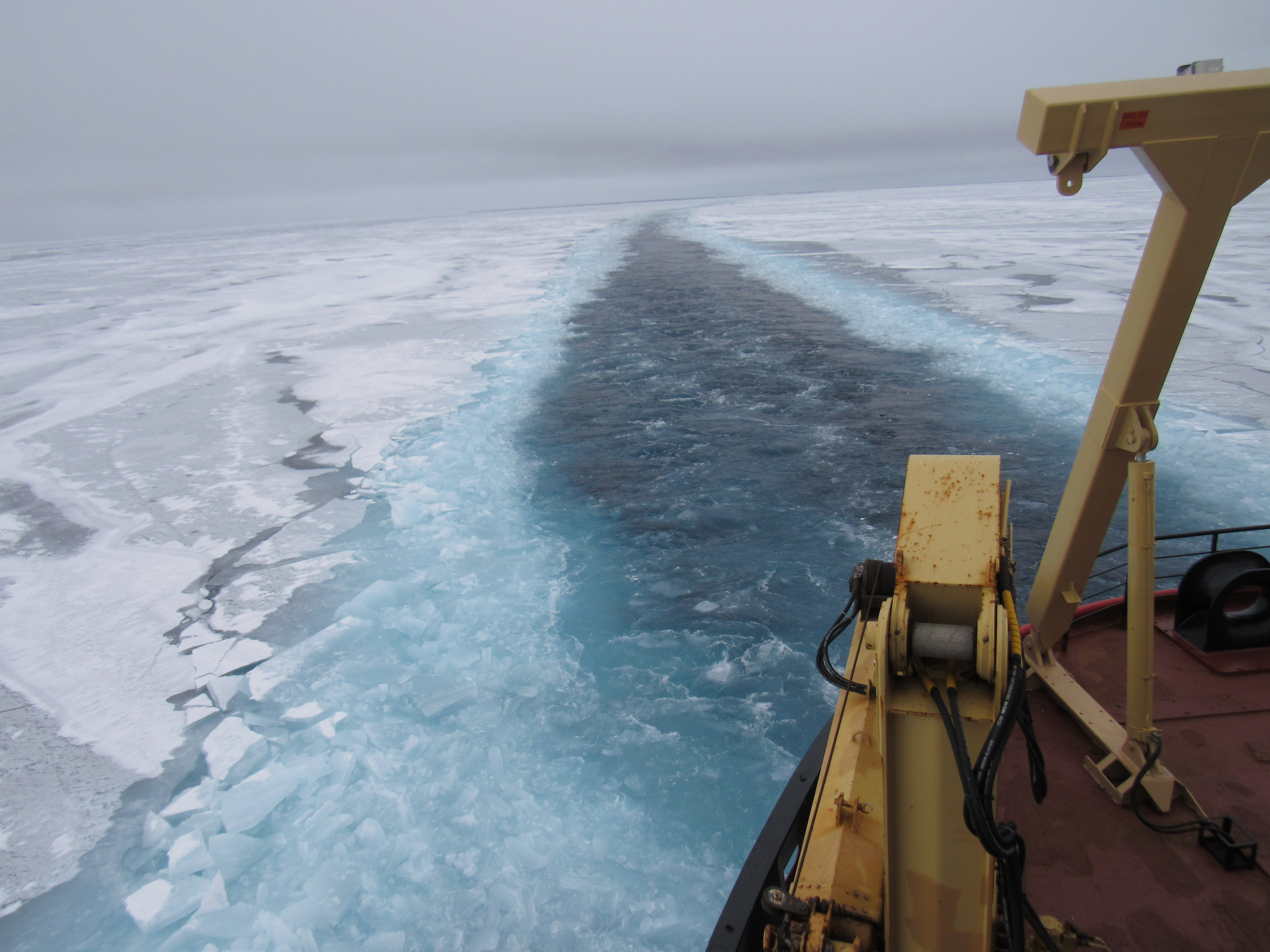 A view of the wake from the stern as the ship makes its way through the sea ice. Aboard the CCGS Louis S. St-Laurent in the Beaufort Sea.