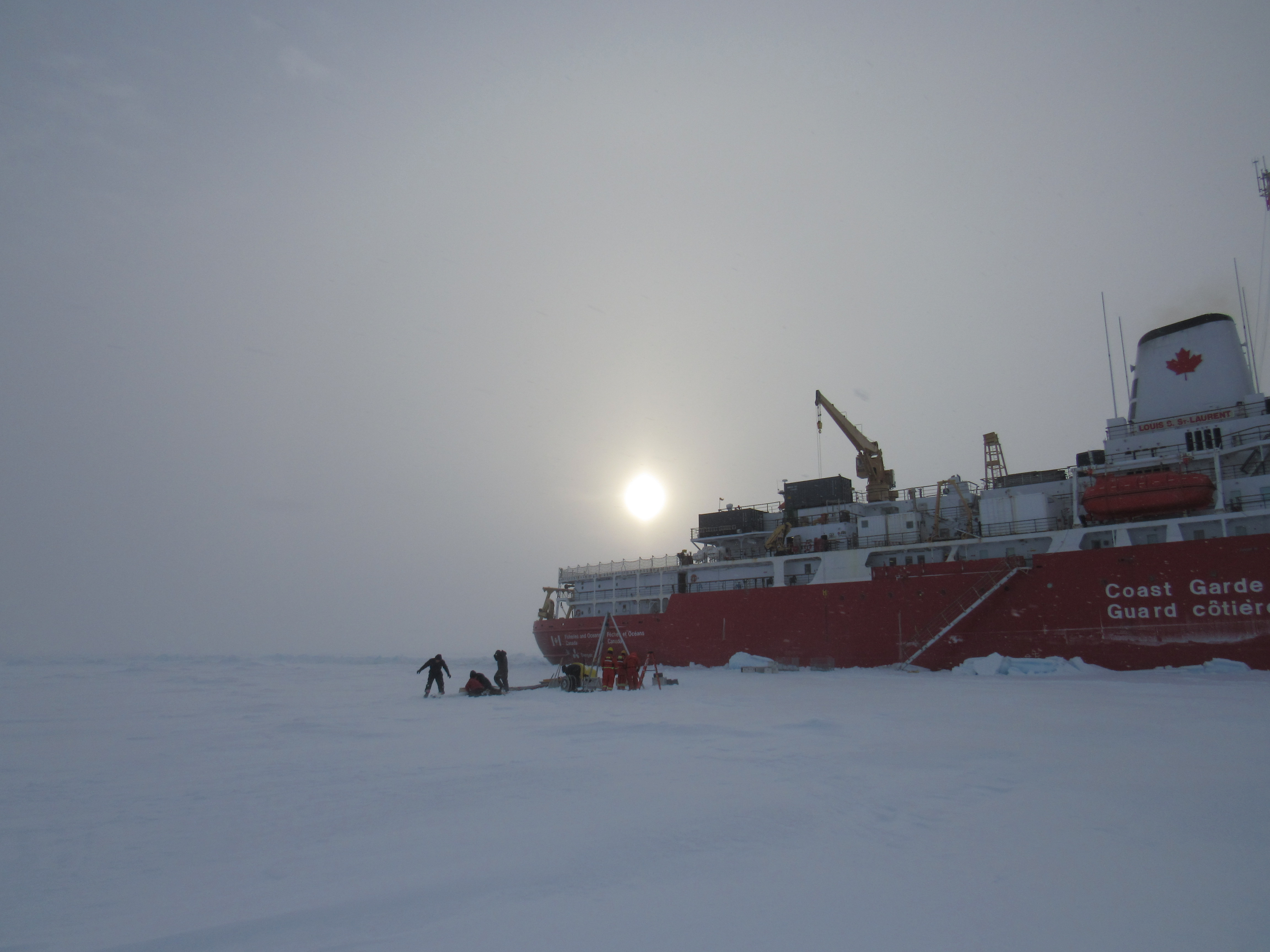 Crew members work on the sea ice to deploy an Ice-Tethered Profiler (ITP). On the sea ice near the CCGS Louis S. St-Laurent in the Beaufort Sea.