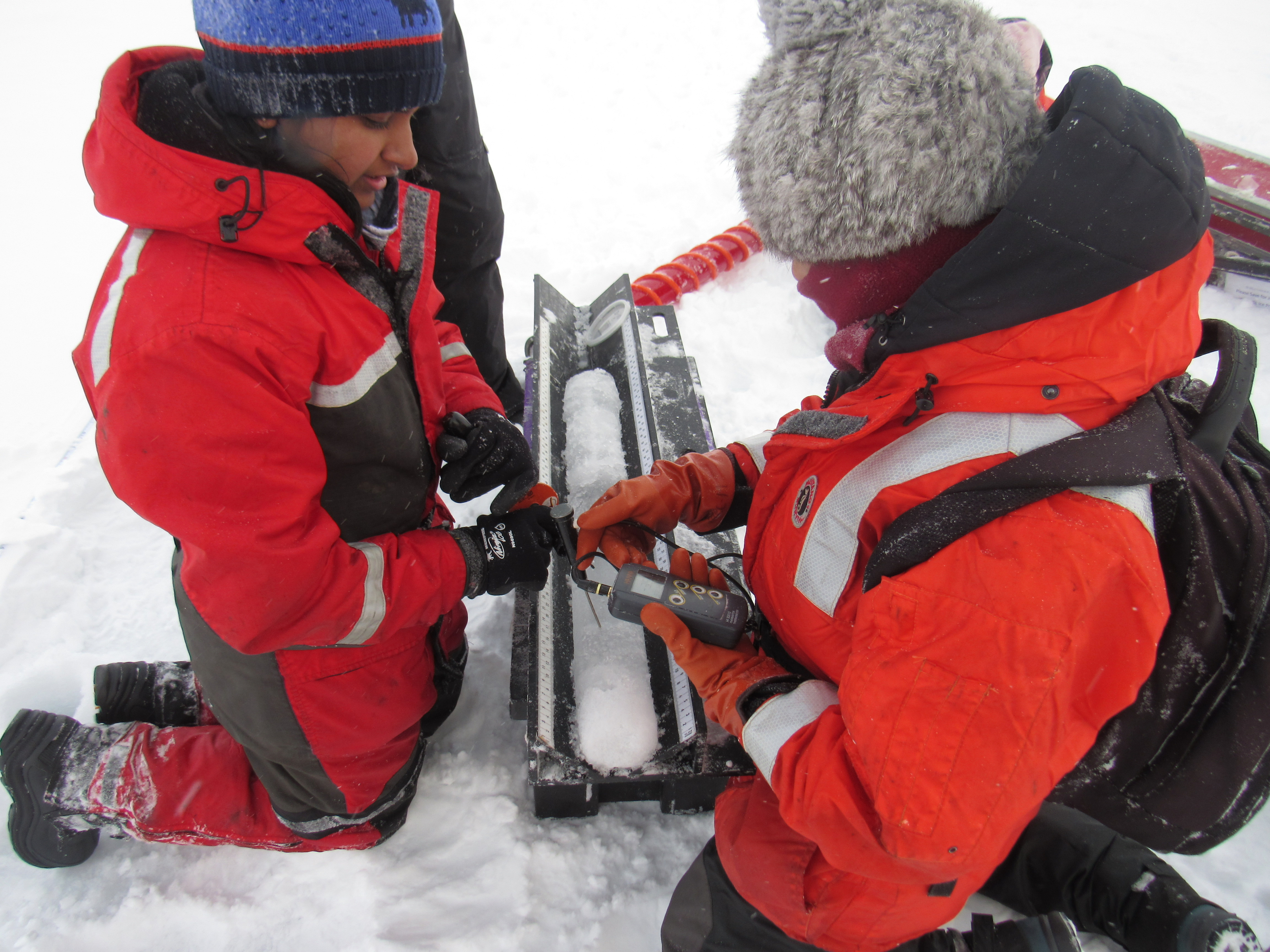 Arthi Ramachandran works on an ice core temperature measurement. On the sea ice near the CCGS Louis S. St-Laurent in the Beaufort Sea.
