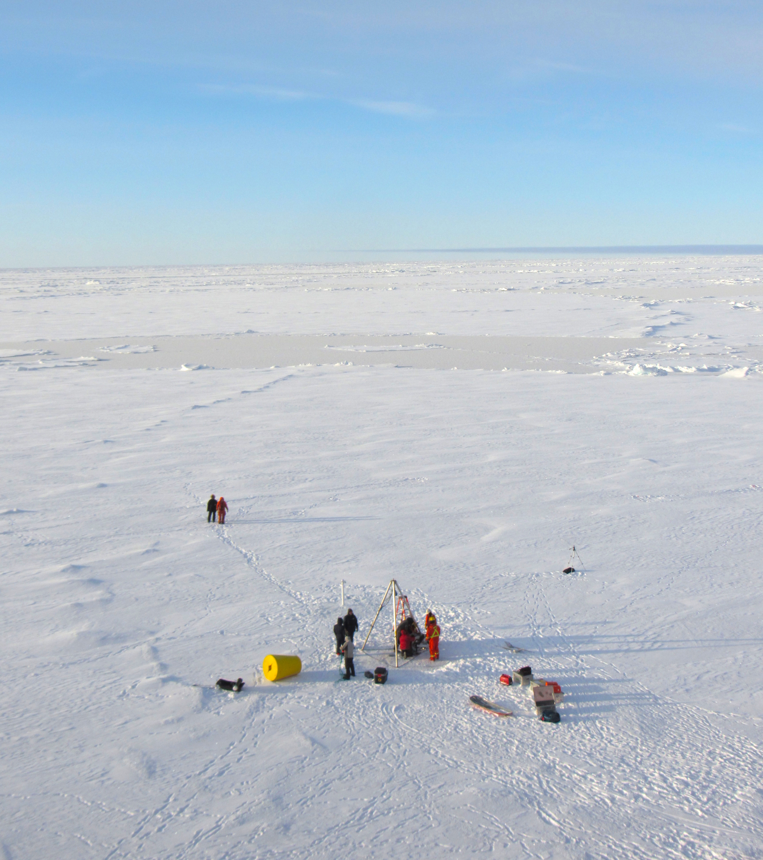 The team works on deploying instruments at this ice station. Aboard the CCGS Louis S. St-Laurent in the Beaufort Sea.