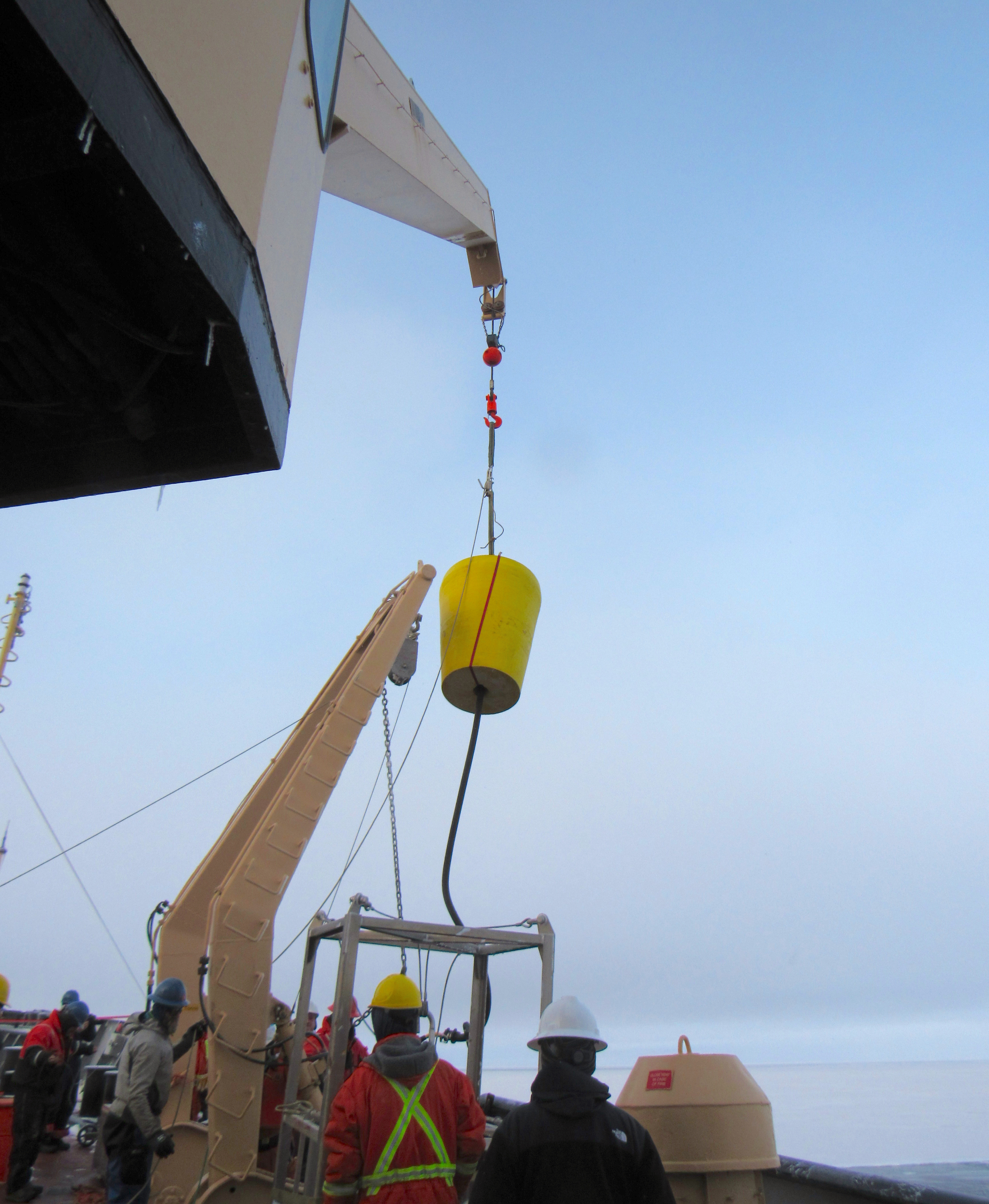 The Ice-Tethered Profiler (ITP) buoy is lifted by a crane off of the deck and over the side of the ship. Aboard the CCGS Louis S. St-Laurent in the Beaufort Sea.