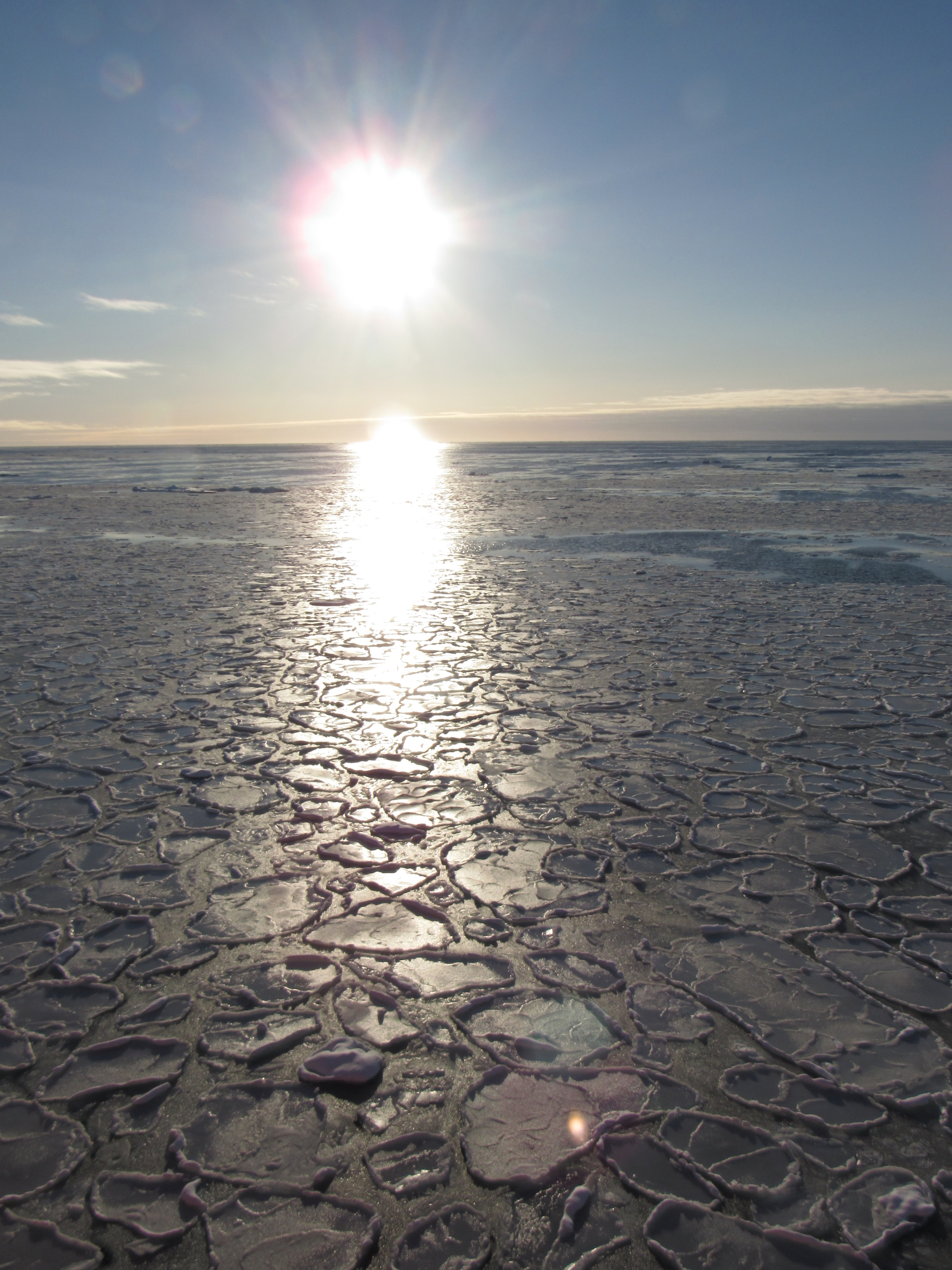The arctic sun shines on some pancake ice in the Beaufort Sea. Aboard the CCGS Louis S. St-Laurent in the Beaufort Sea.