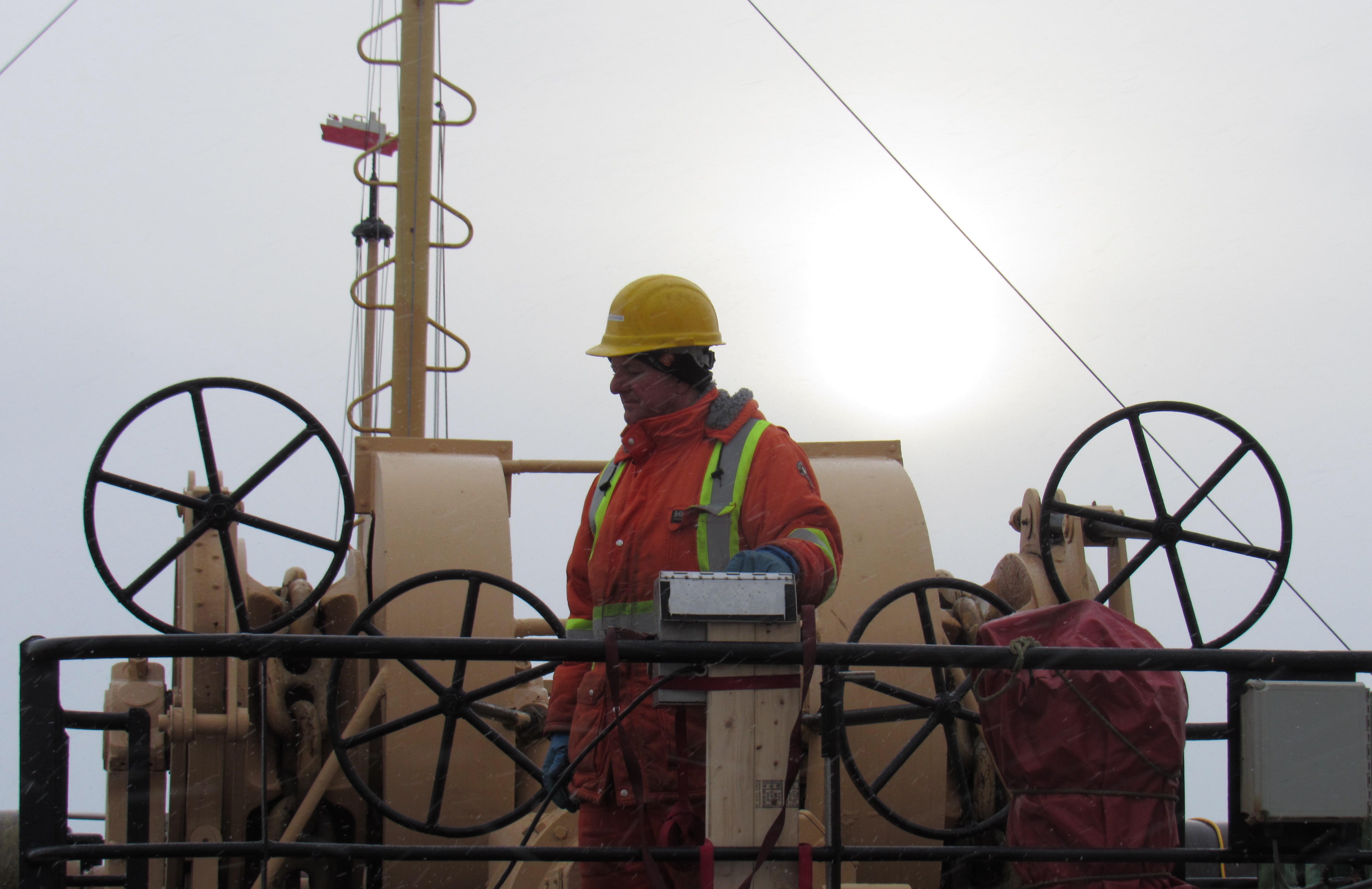 Deckhand Wilfred Parsons operates the cable winch during a mooring deployment. Aboard the CCGS Louis S. St-Laurent in the Beaufort Sea.