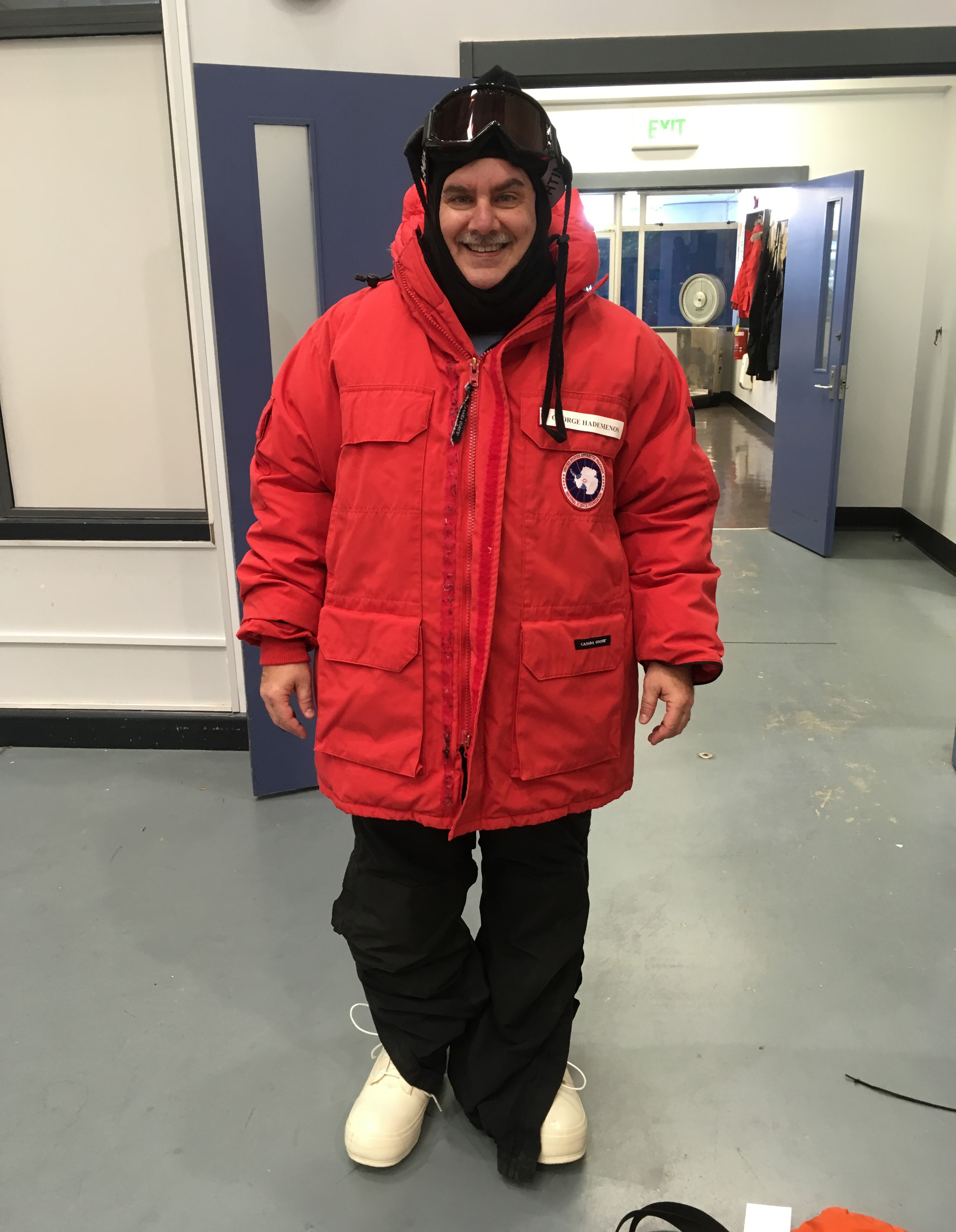George Hademenos tries on his issued extreme cold weather (ECW) gear at the United States Antarctic Program's (USAP) Clothing Distribution Center in Christchurch, New Zealand.