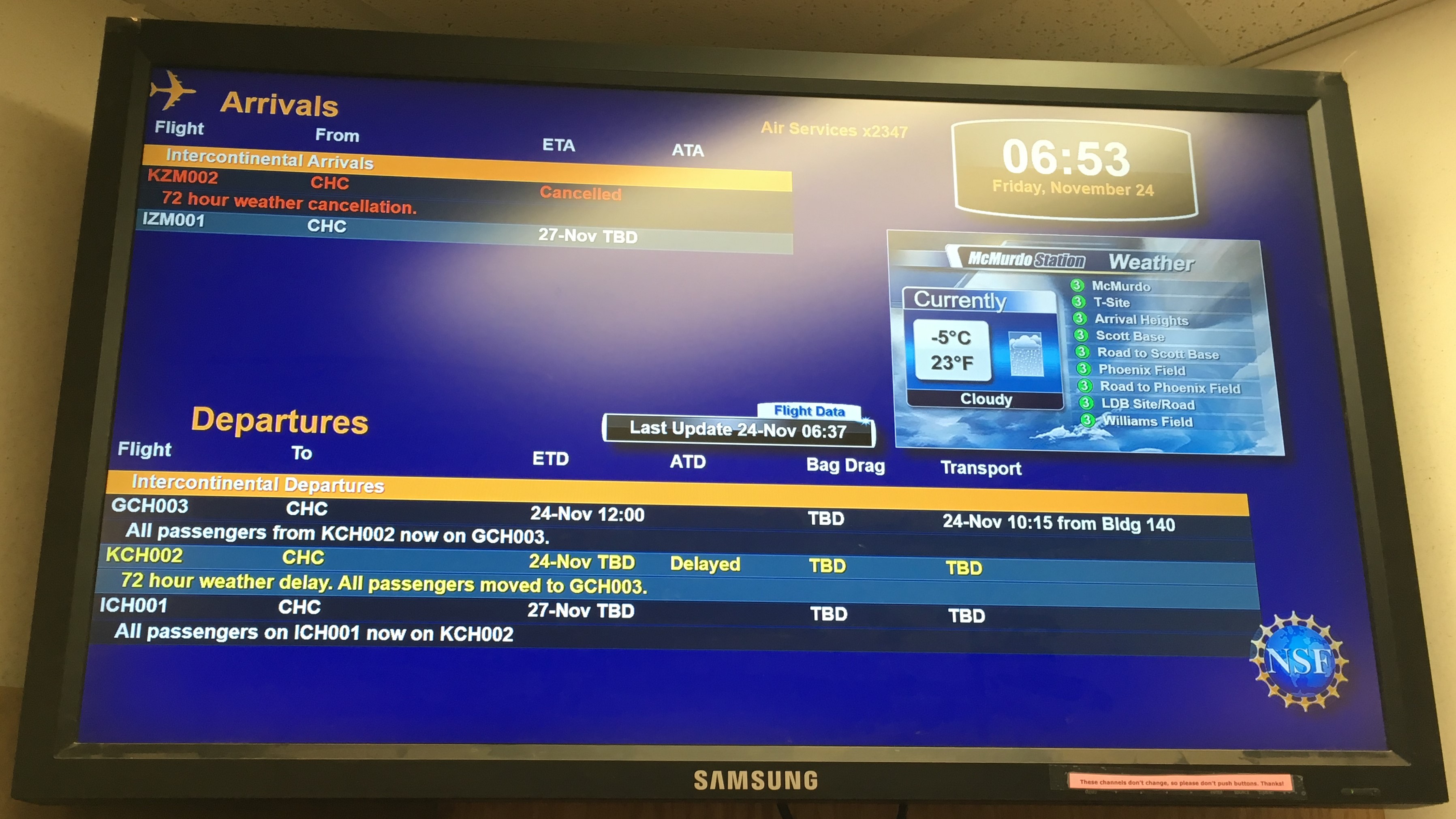 A monitor in the galley details the status of flights departing and arriving into McMurdo Station, Antarctica.