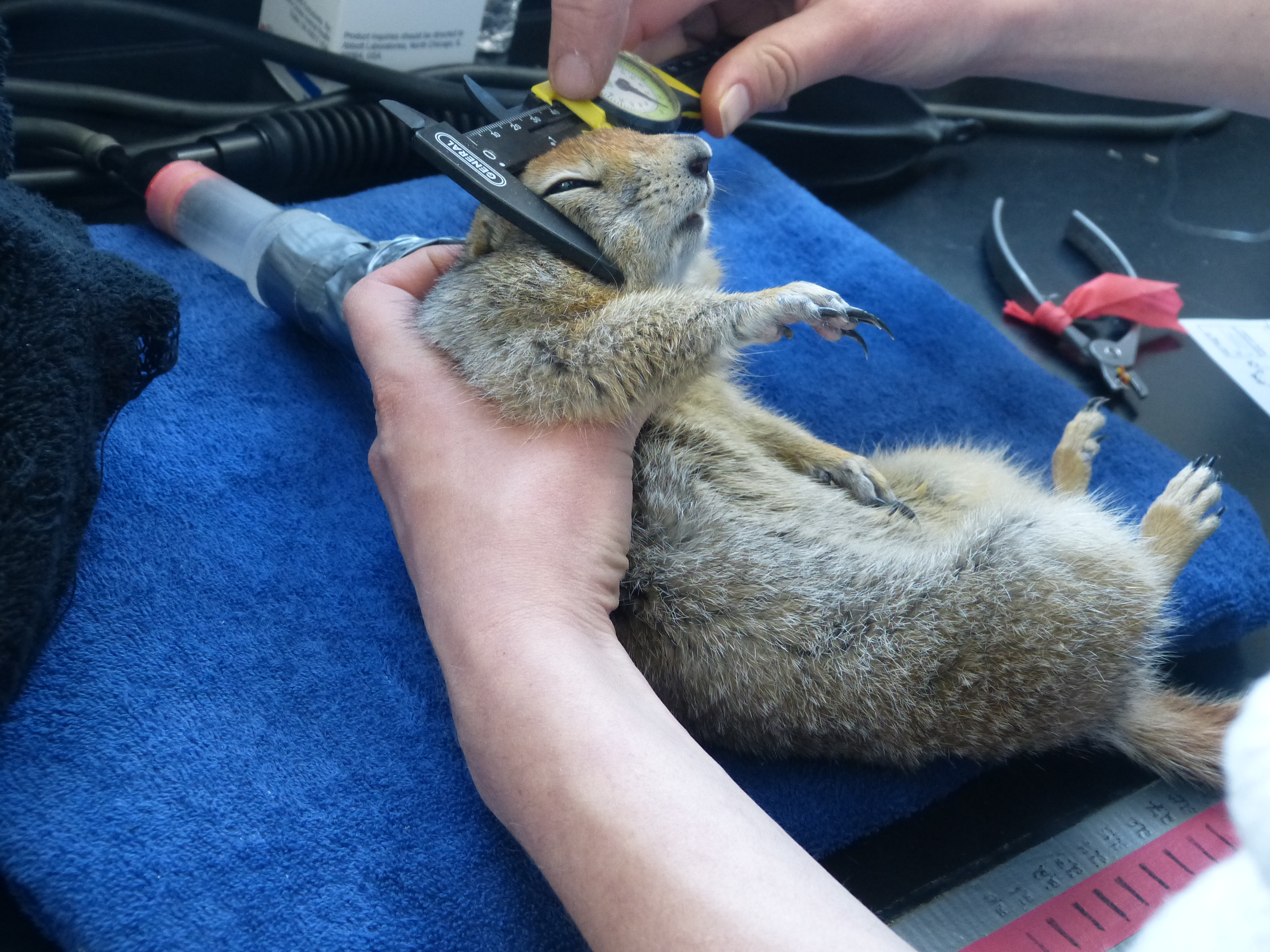 Helen Chmura measures an Arctic ground squirrel's head diameter with calipers in the Winter Lab. Toolik Field Station, Alaska.