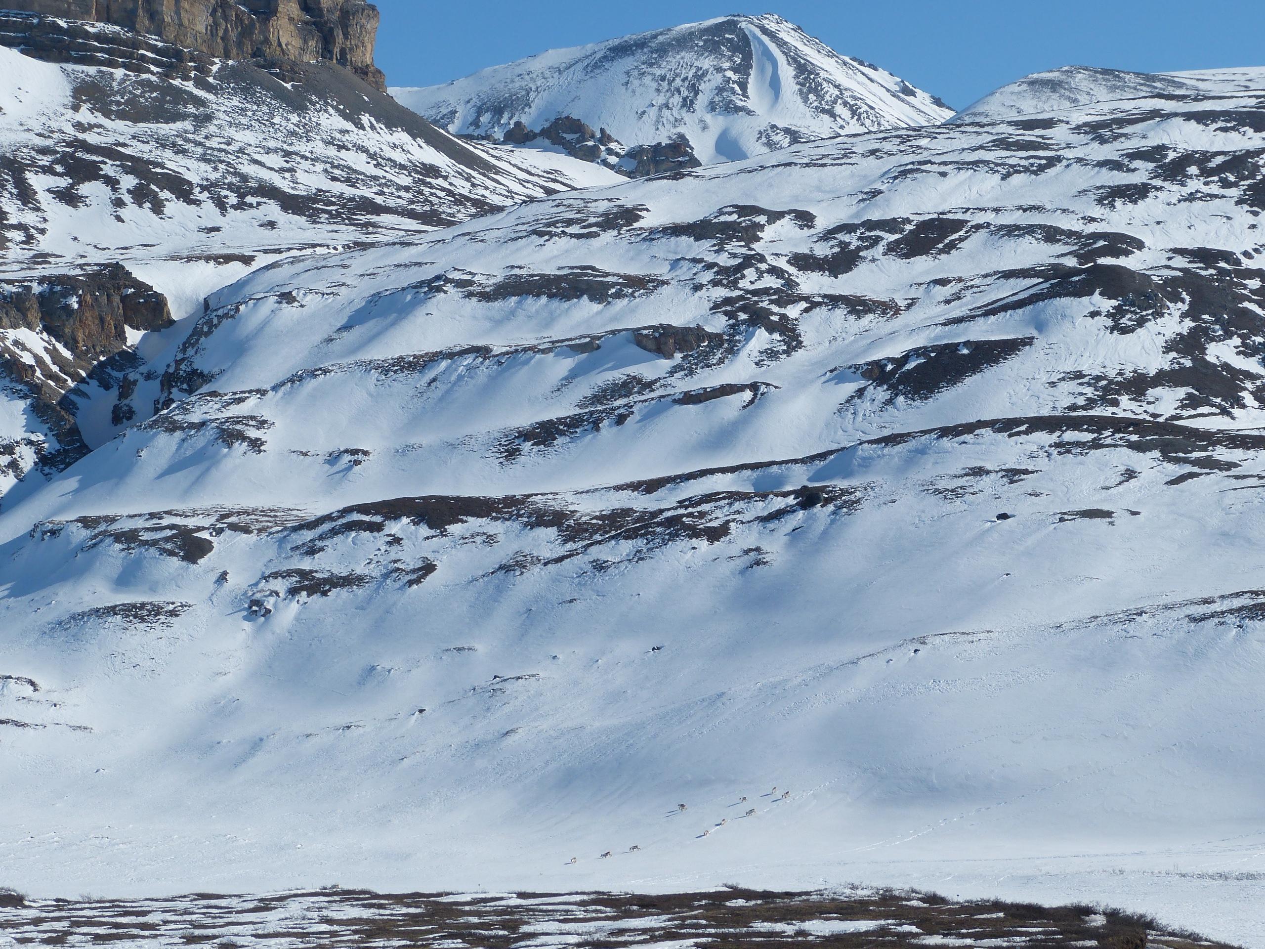 Caribou walk down the hill to the tundra. At the East Atigun field site near Toolik Field Station, Alaska.