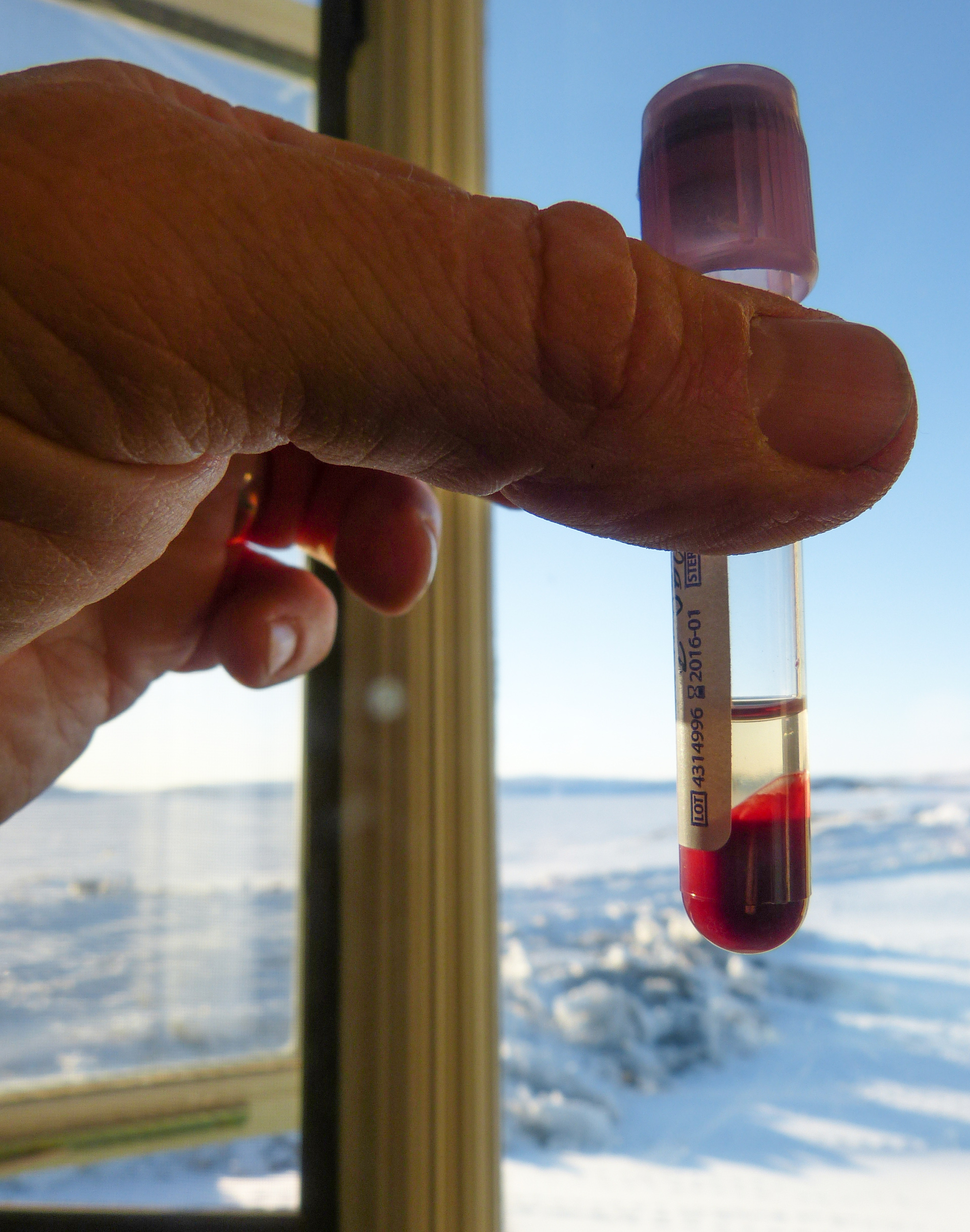 Helen Chmura holds a centrifuged blood sample from an Arctic ground squirrel in the Winter Lab. Toolik Field Station, Alaska.