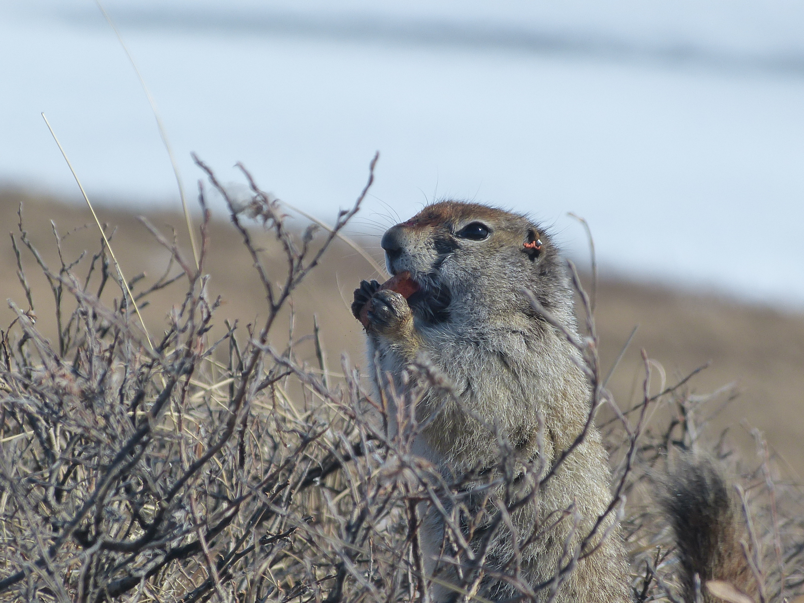 An Arctic ground squirrel eats a carrot at the East Atigun field site near Toolik Field Station, Alaska.