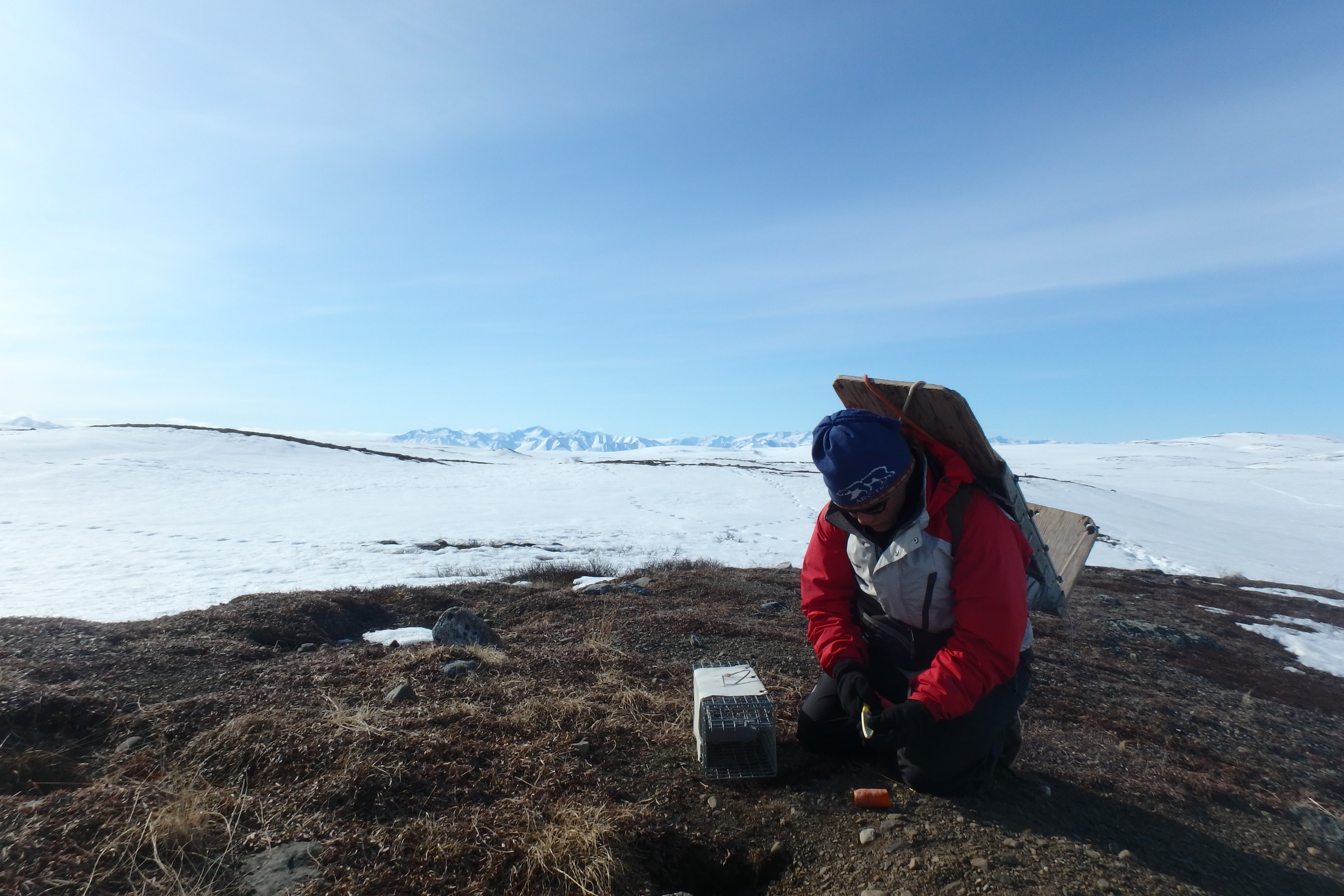 Jennifer Baldacci sets a squirrel trap while having a "schlepper" for hauling squirrel traps on her back. Toolik Field Station, Alaska.