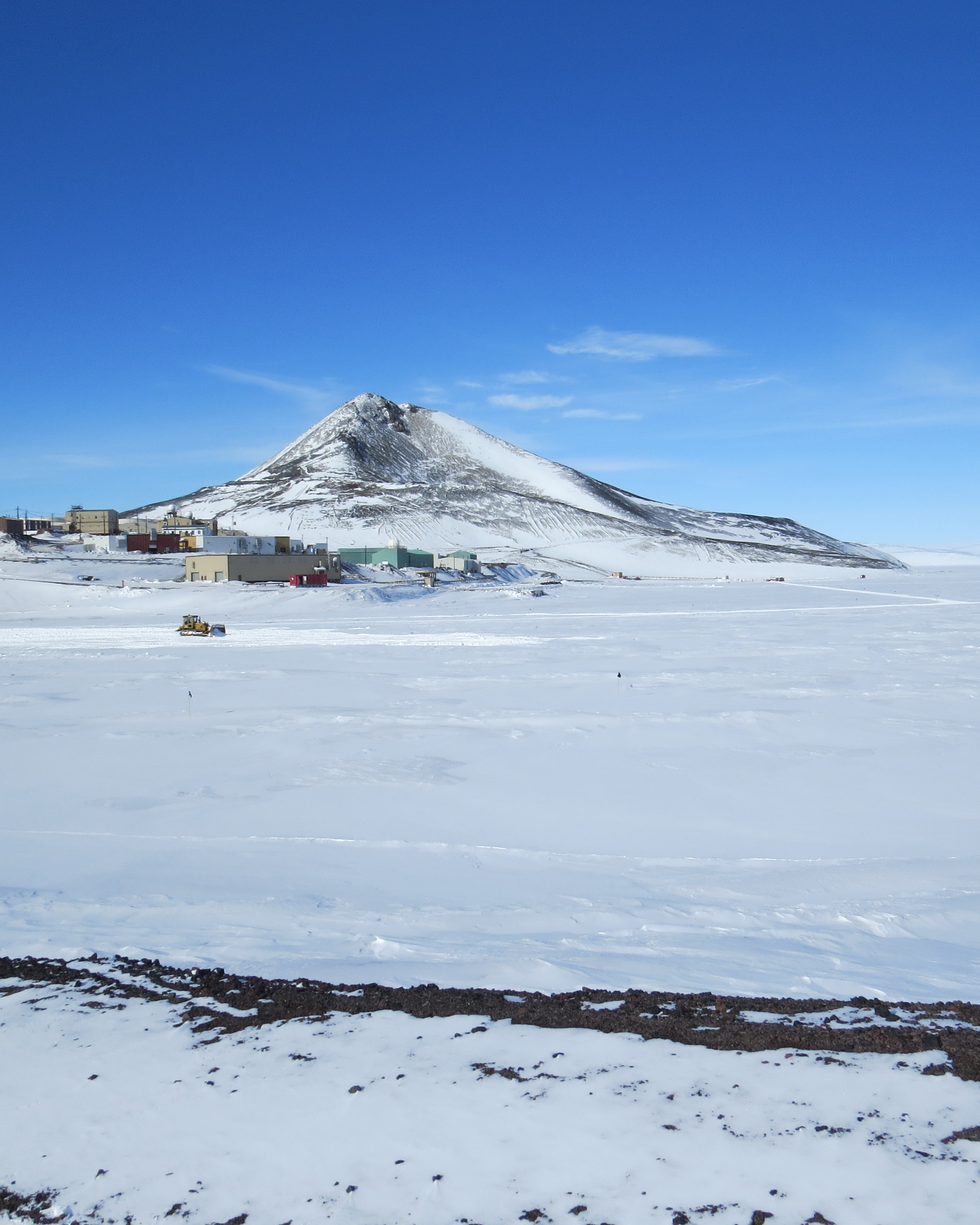 A view of Observation Hill from Discovery Hut. McMurdo Station, Antarctica.
