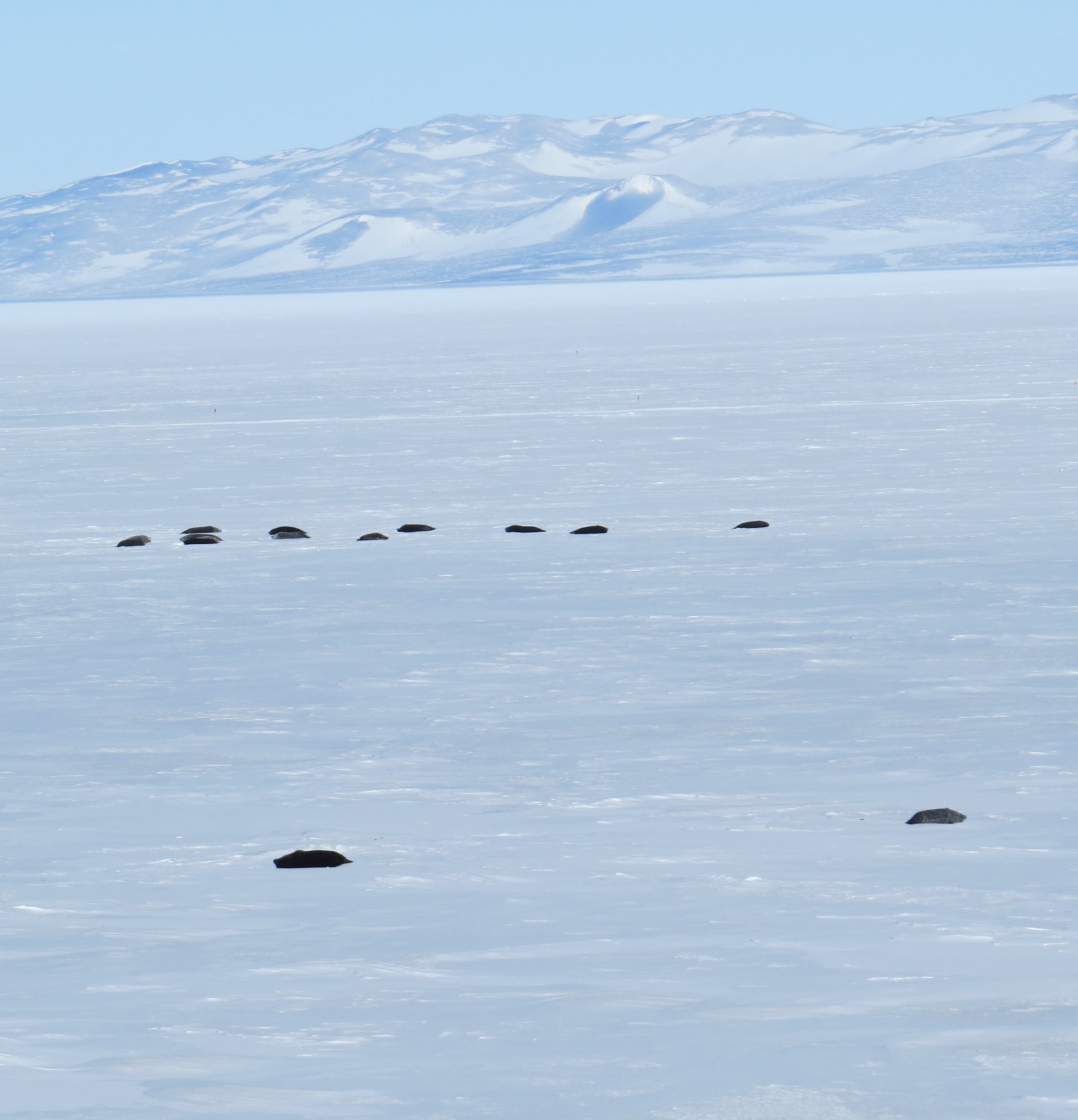 A large group of seals on the sea ice just beyond McMurdo Station, Antarctica.