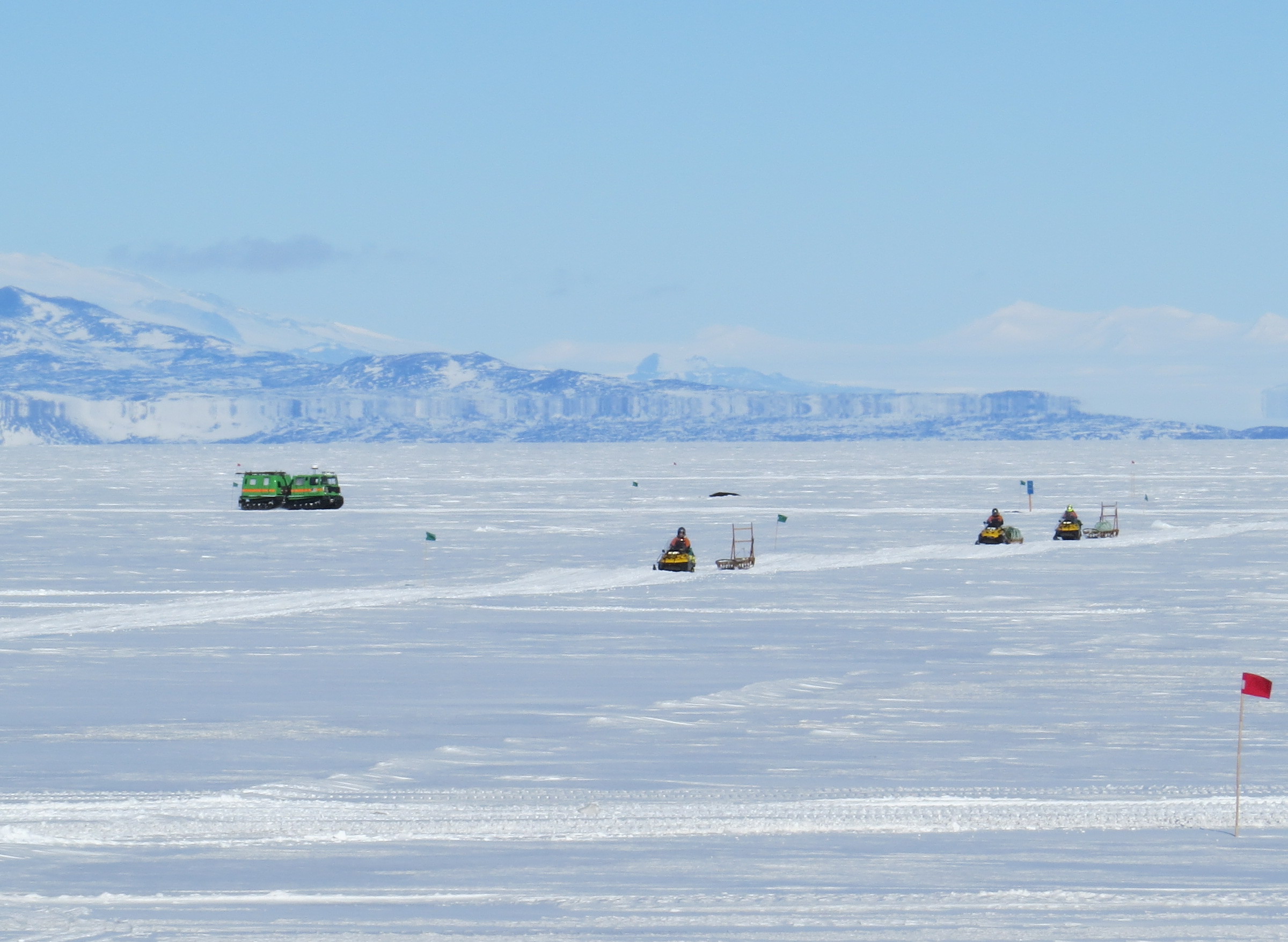The New Zealand team approaches to pick up the team. They bring three snowmobiles and an all terrain snow vehicle, the Hägglund. McMurdo Station, Antarctica.