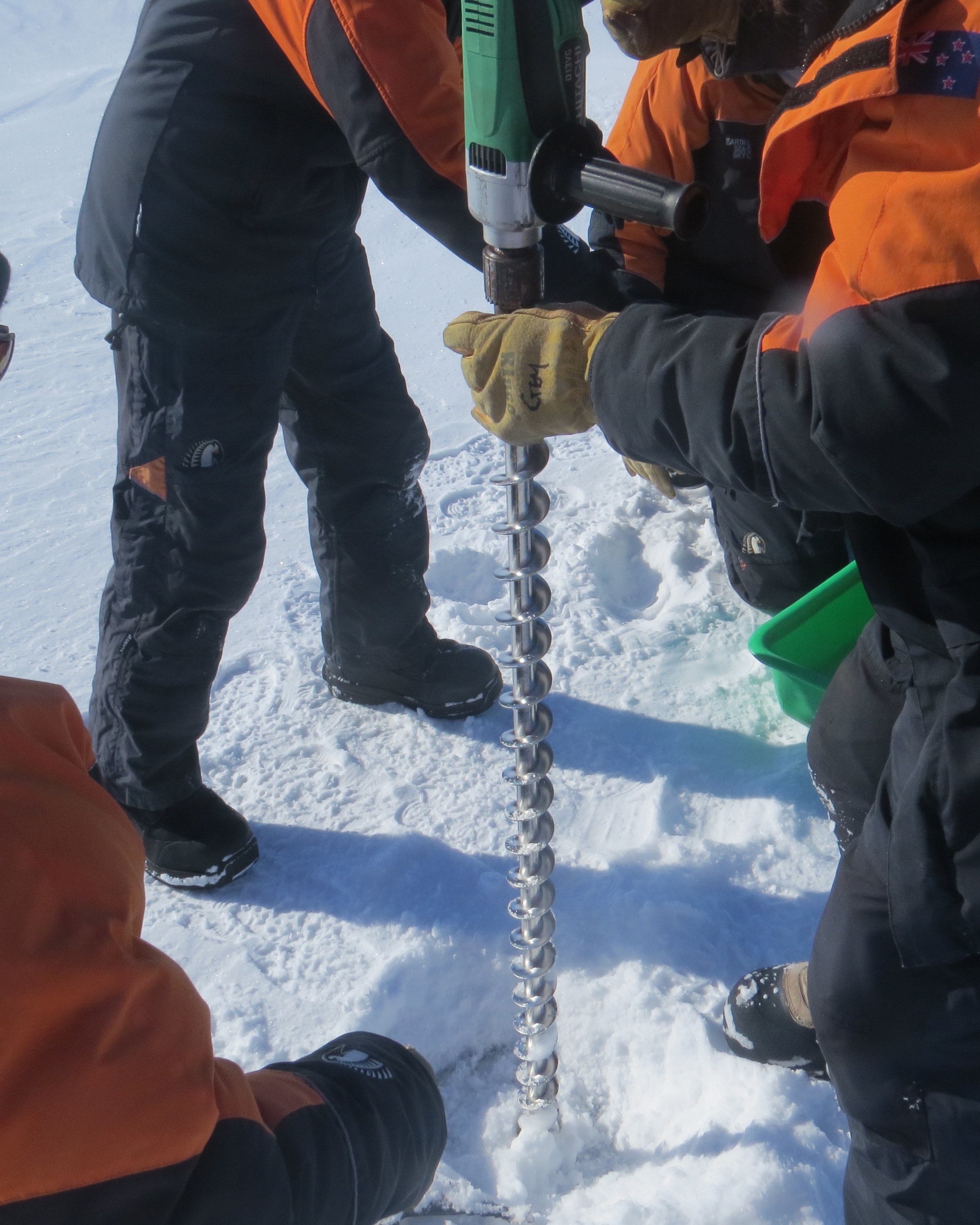 Jennifer Bault: "This is drilling, which is different than coring. Drilling simply makes a hole for measuring devices or cameras to be lowered into it." On the sea ice of the Ross Sea, Antarctica.
