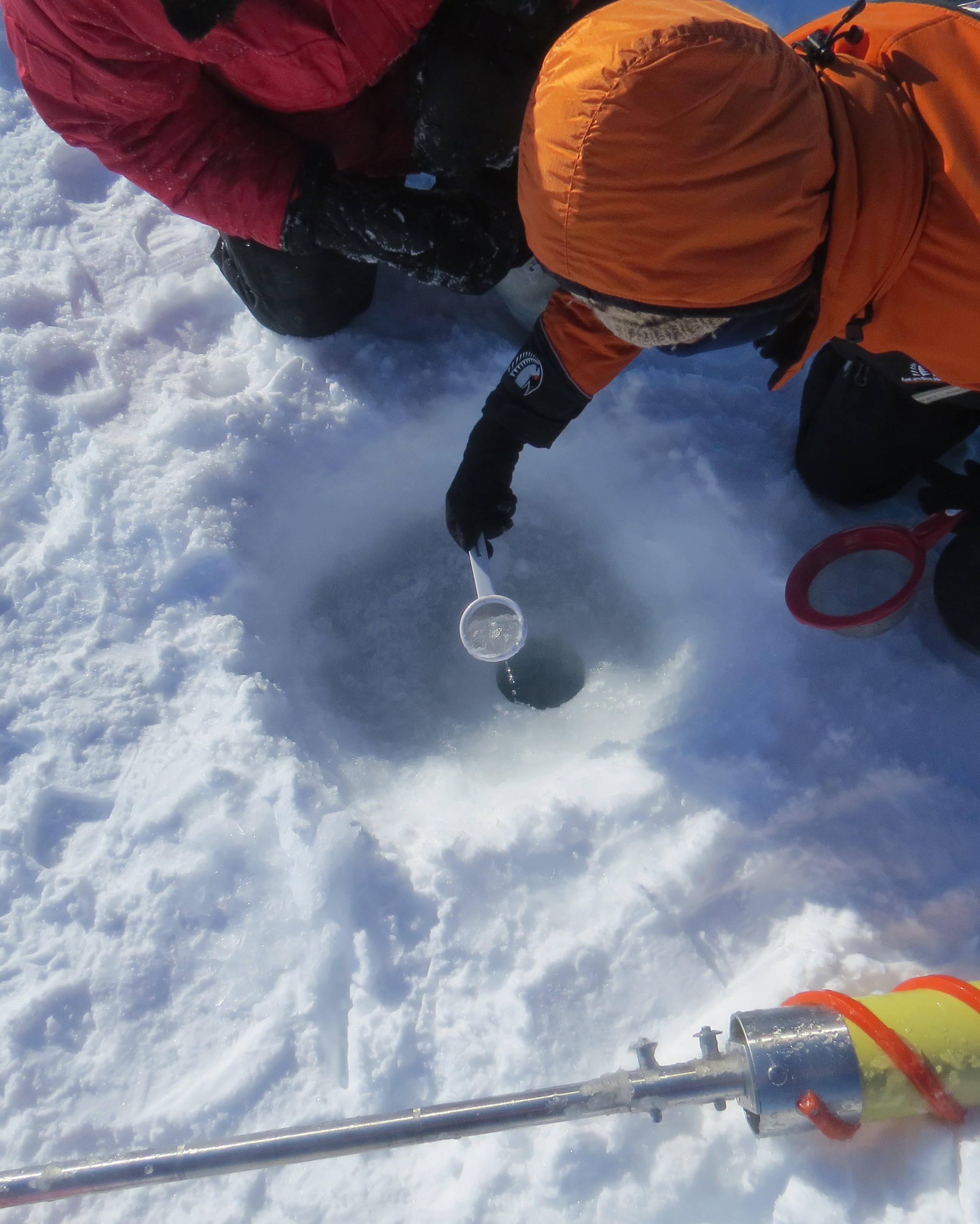 A standard household strainer is used to remove ice crystals from the team's coring hole, so that measurements can be made. On the sea ice of the Ross Sea, Antarctica.