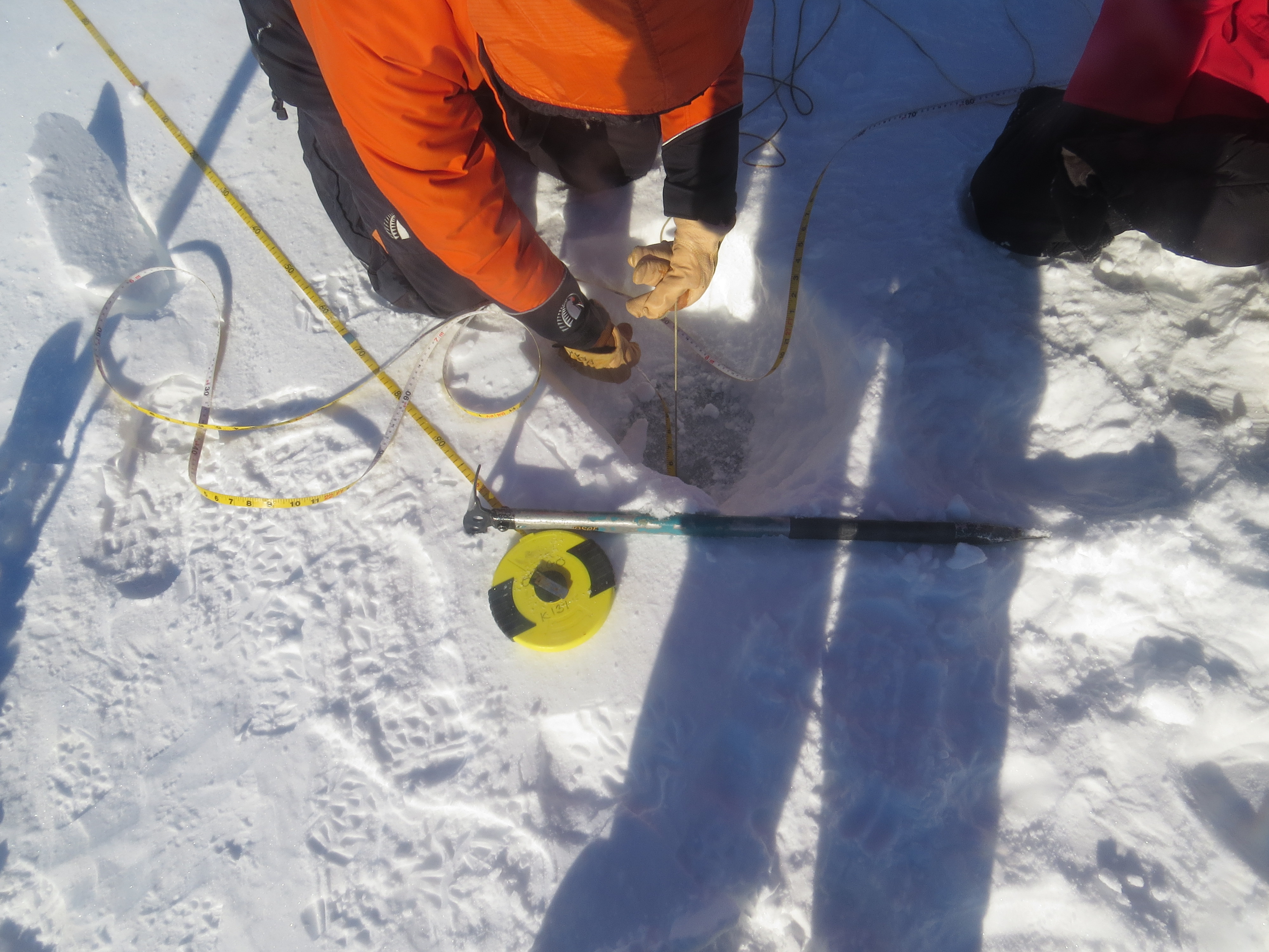 Using a tape measure and weight, the team can find the sea ice thickness as well as the thickness of the slushy layer under the ice. On the sea ice of the Ross Sea, Antarctica.