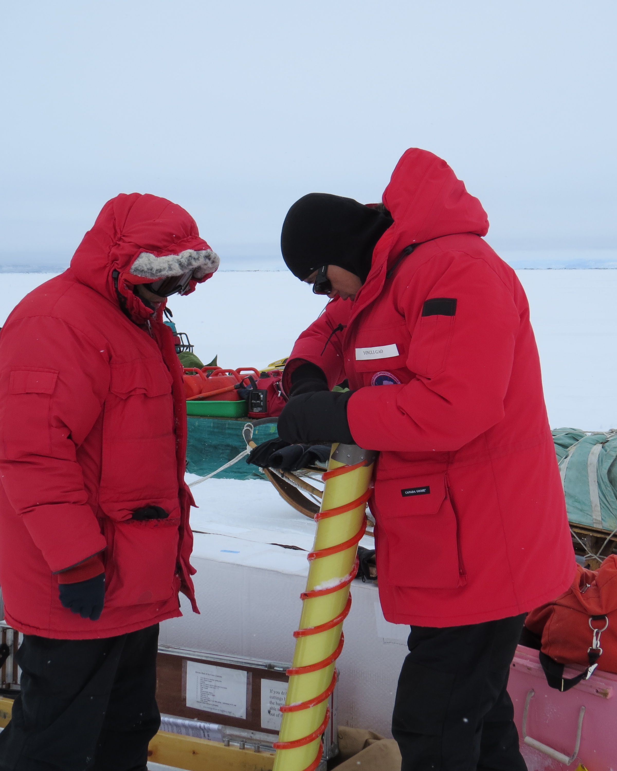 Yongli Gao and Hongjie Xie prepare the ice corer. On the sea ice of the Ross Sea, Antarctica.