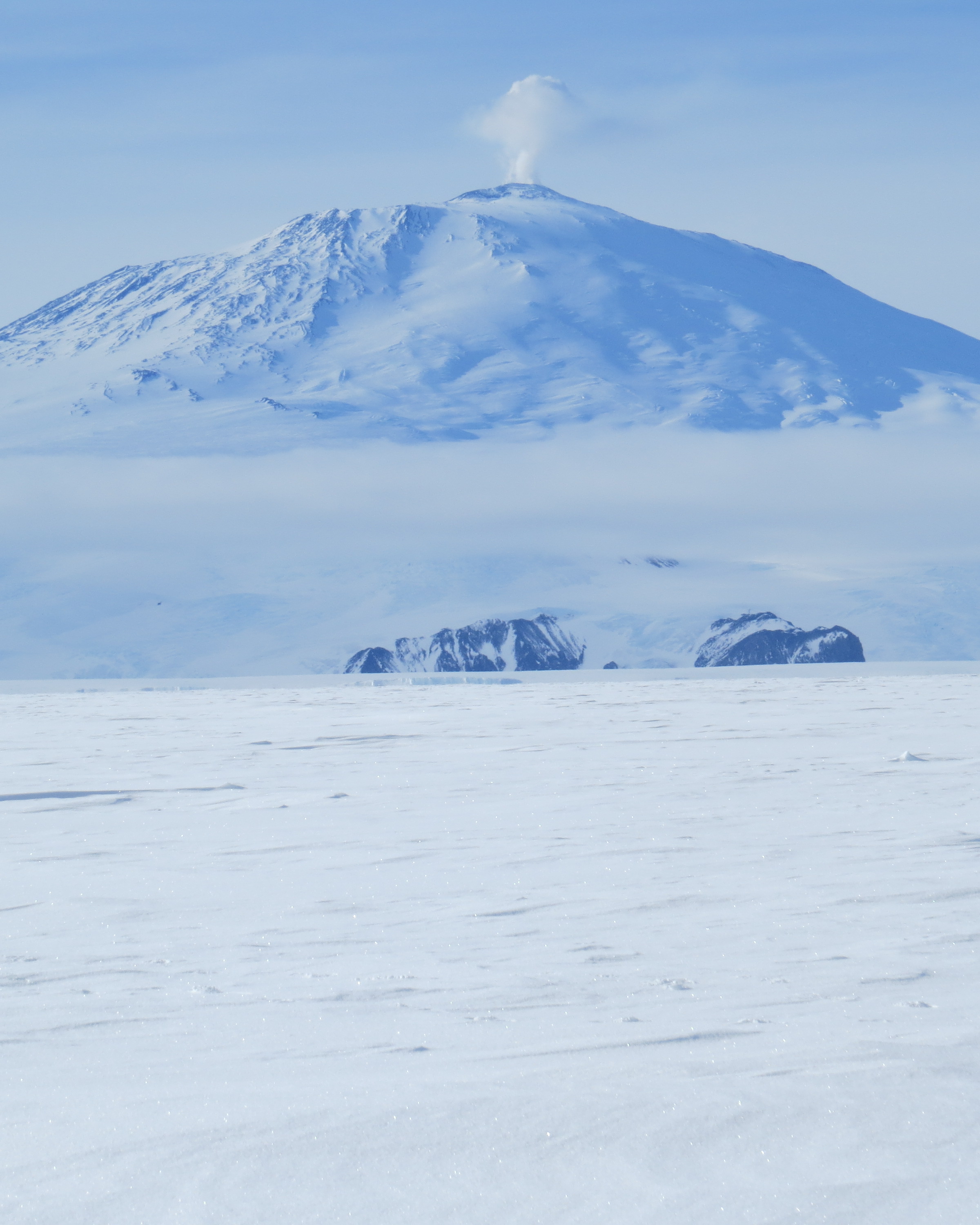 Jennifer Bault: "A fairly significant plume of steam rising from Mt. Erebus." On the sea ice of the Ross Sea, Antarctica.