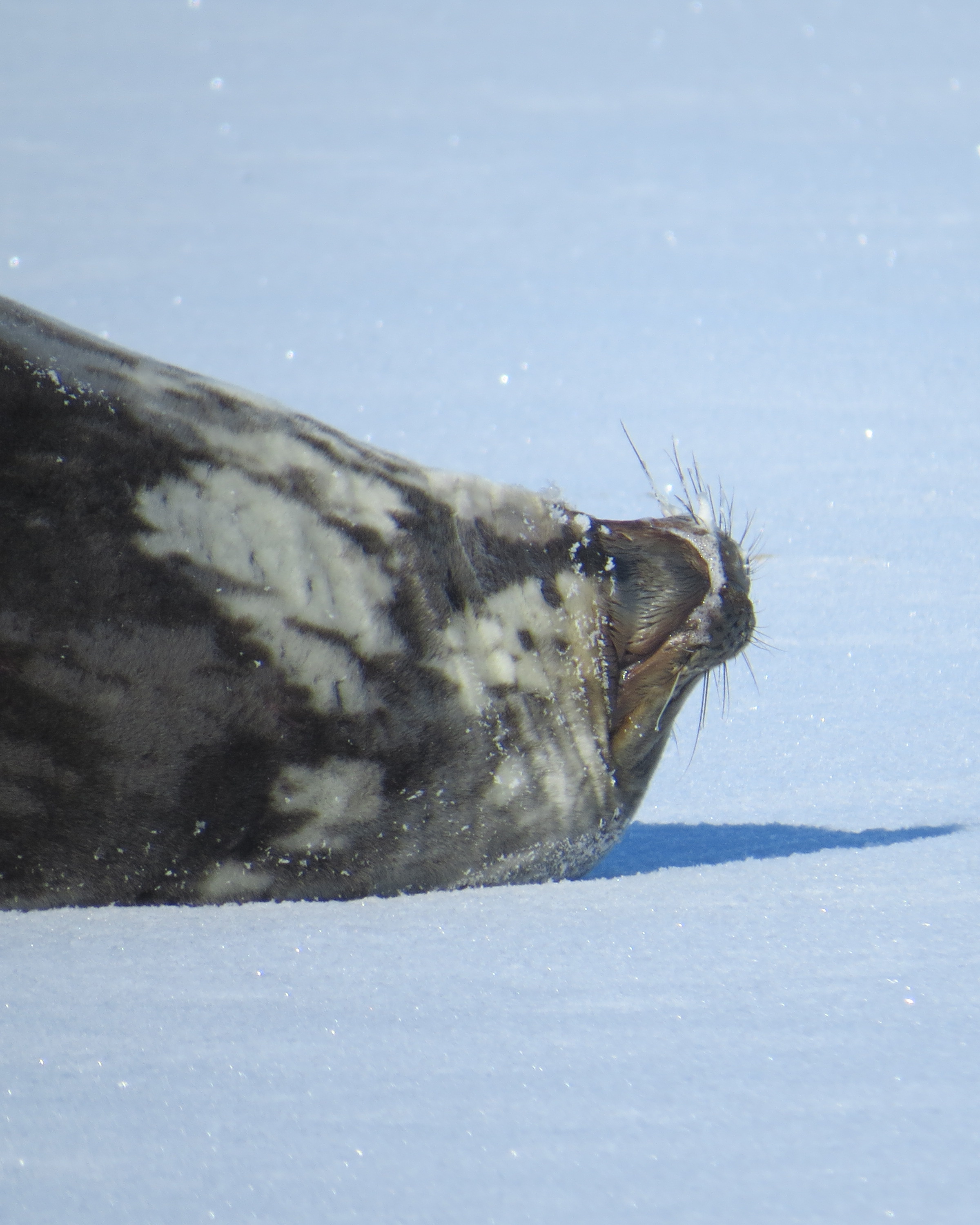 Jennifer Bault uses her camera's zoom lens to check out the whiskers on a Weddell seal. On the sea ice of the Ross Sea, Antarctica.