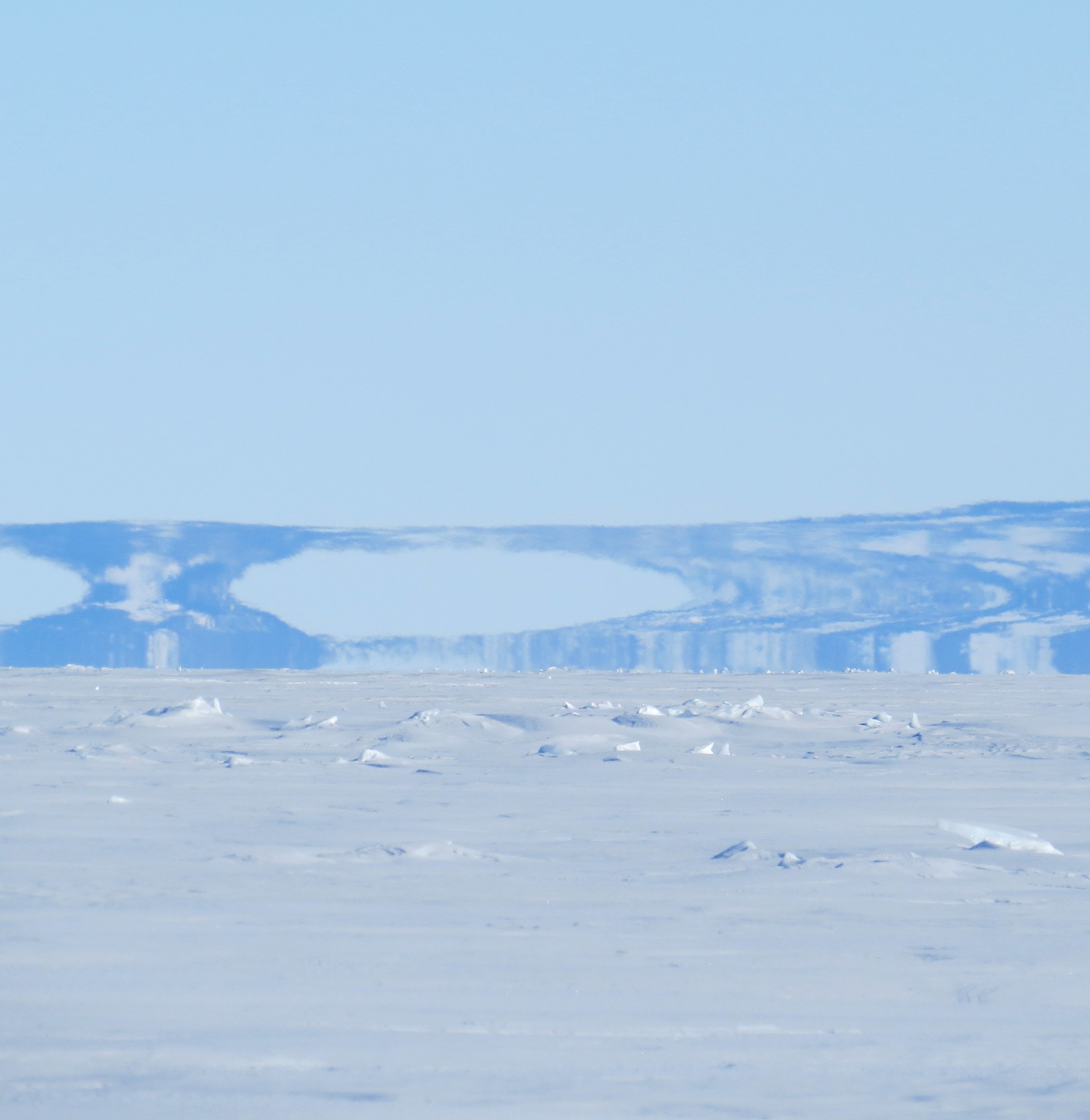 Jennifer Bault: "Sometimes we look out on the sea ice to see mirages. Look at the wavy lines towards the bottom of the rock formation." On the sea ice of the Ross Sea, Antarctica.